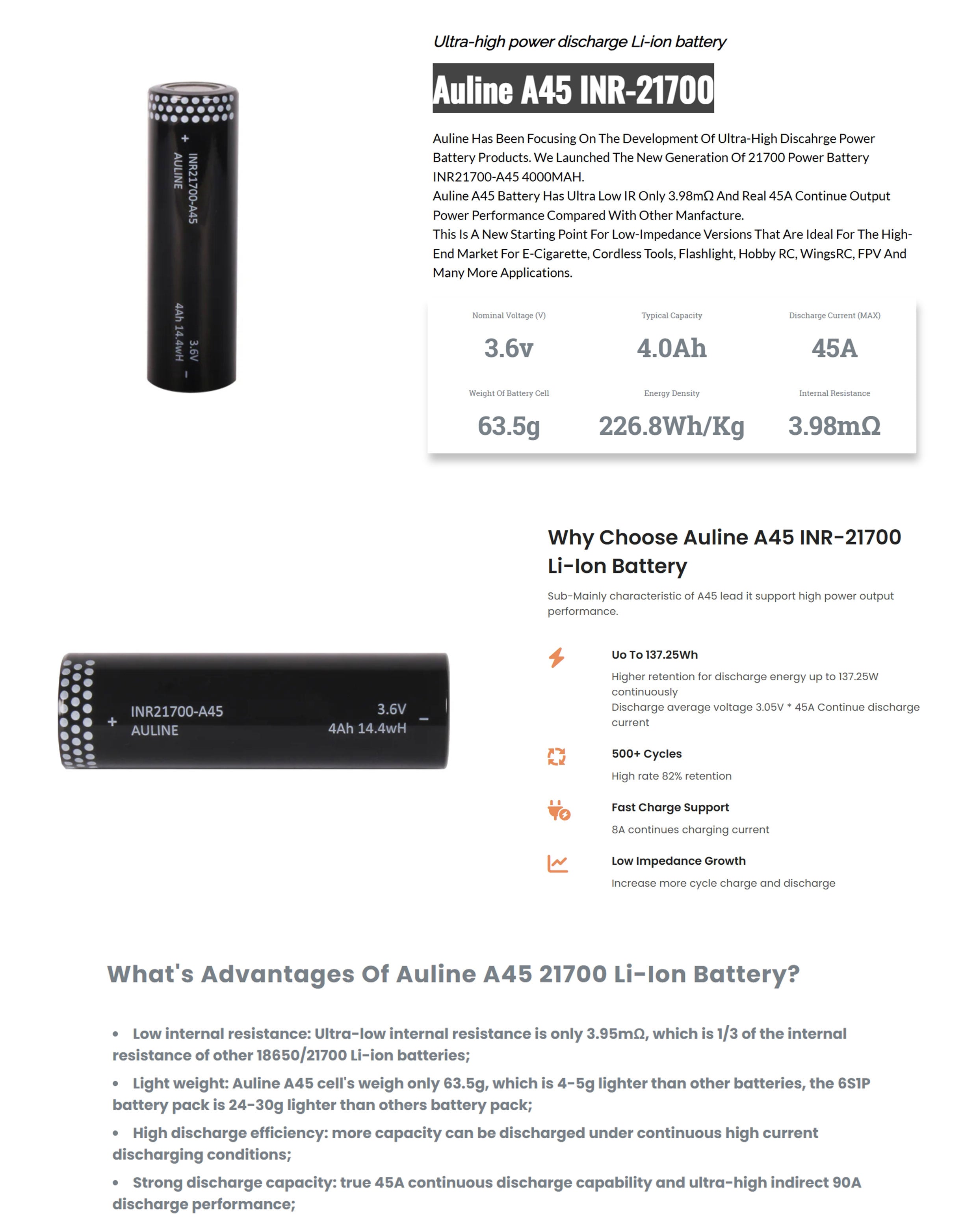 - 1x Auline 22.2V 6S 21700 4000mAh 35A Li-Ion Battery - XT60