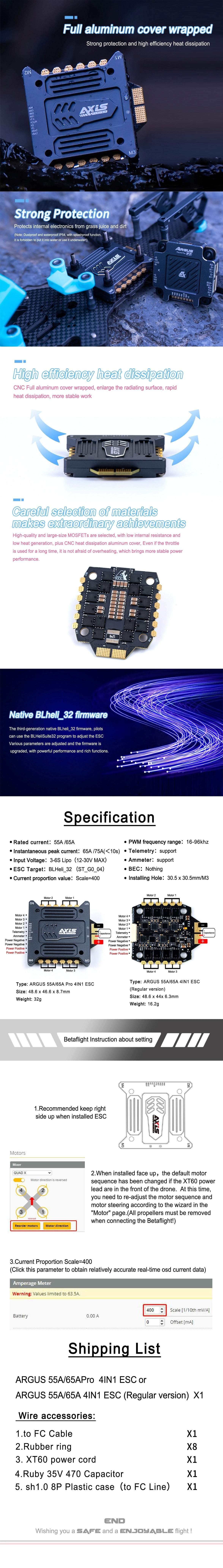 New from AxisFlying, the Argus PRO 32bit 65A ESC. The Argus PRO series uses a wrapped all-aluminum cover that can get IP54 to protect the PCB. The Argus series is PCB electronic only. This is a premium-built ESC from AxisFlying, fully capable of pushing 6S!