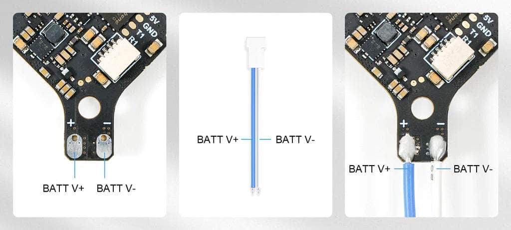 BT2.0 1S Whoop Cable Pigtail is composed of blue wire and white wire. The blue wire is the positive pole(+), the white wire is the negative pole(-). When you resolder your board, please pay attention to the connection method.