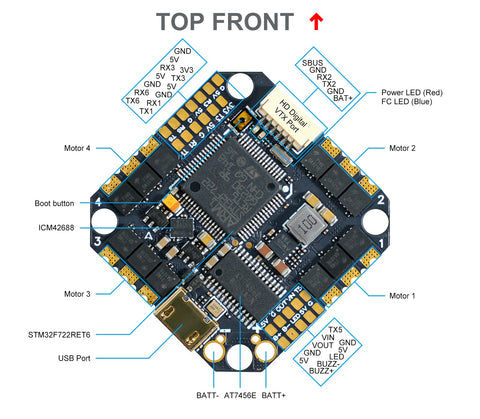 The below picture is the top front of the F722 35A AIO Brushless FC. (Both V1 and V2 boards have the same solder pad and connector ports.)