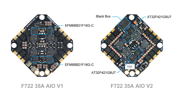 The F722 35A AIO FC has two boards with different ESC versions for choice. The V2 board uses AT32F421G8U7 MCU, a 32-bit ESC chip, with BLHeli_32 ESC firmware. This firmware supports up to 128k PWM frequency, featuring faster processing speed and unlocking more functions for the flight.