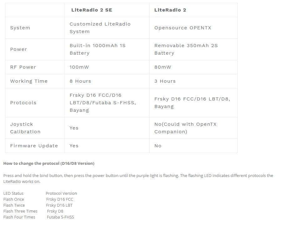- Equipped with a built-in 1000 mAh 1S battery, LiteRadio 2 SE can use up to 8 hours, bringing an excellent endurance performance.