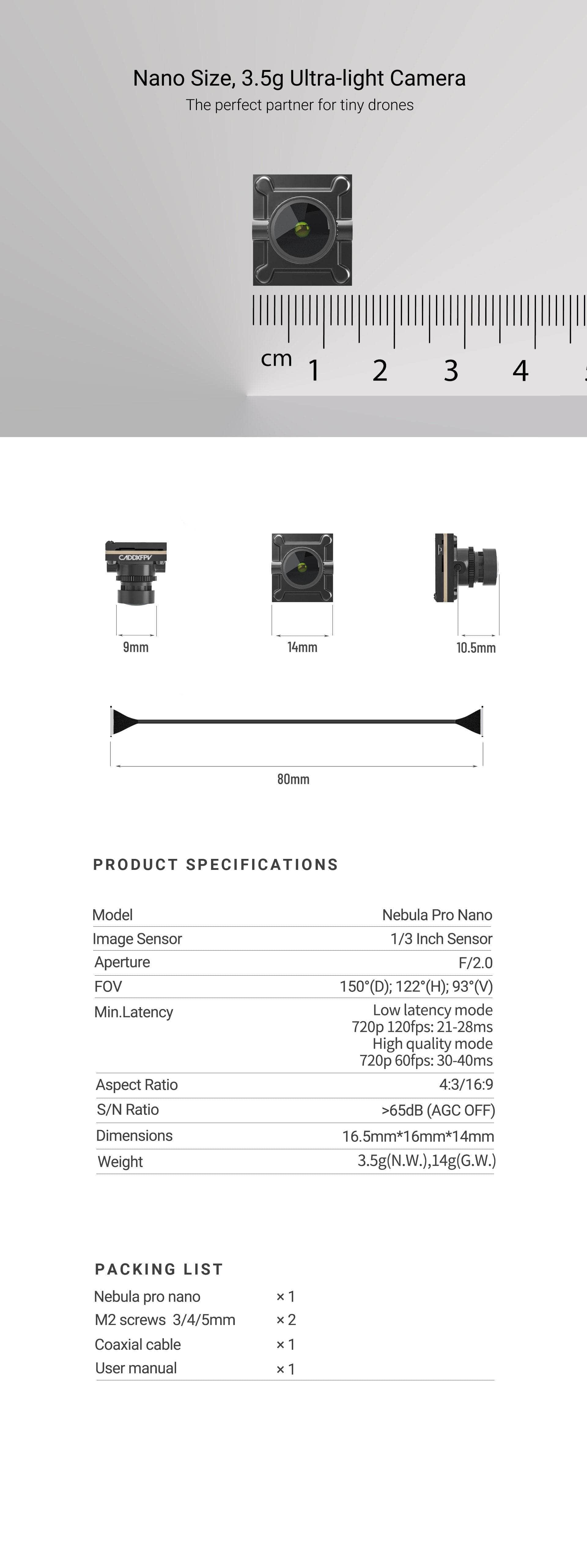 The Caddx Nebula Pro Nano features the same great 720p/120fps performance and low 28ms latency of it's big brother the Nebula Pro Micro and weighs in at only 3.5 grams! If you want 120fps low latency HD in a nano form factor, this is your camera!