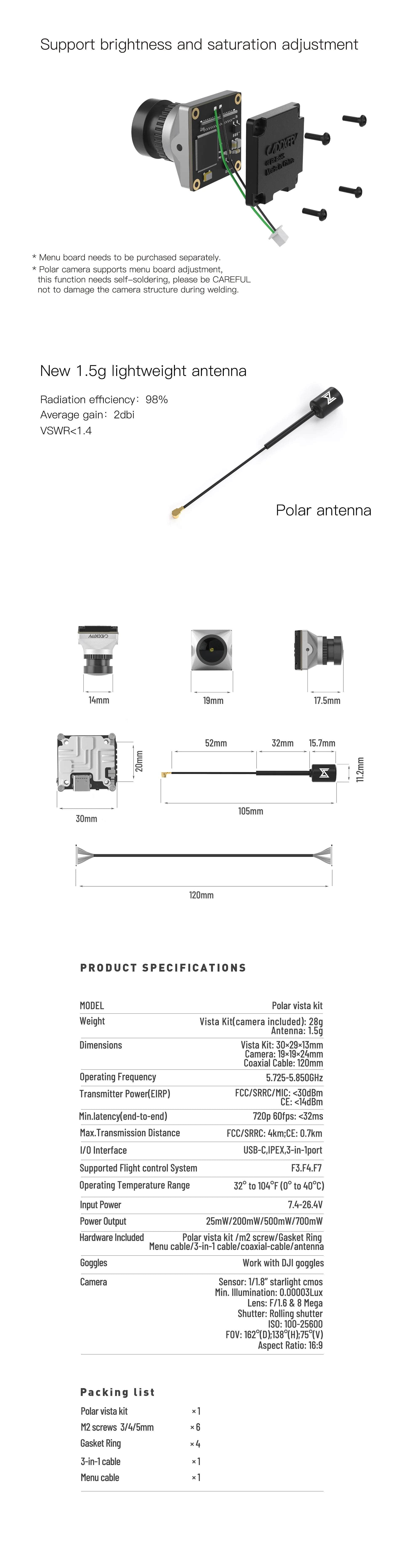 The Caddx Polar Micro Vista Unit is an advanced video transmission module that supports a 5.8 GHz digital video signal and 720p 60fps image transmission, with a transmission range of up to 4km and a minimum end-to-end latency of 32 ms. The vista unit can be mounted on a racing drone and used with DJI FPV Goggles or a remote controller to transmit video, control signals, and flight controller information wirelessly!
