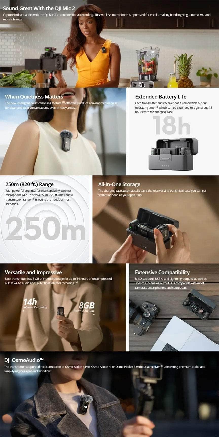 The DJI Mic 2 is a high-quality wireless microphone system designed for crystal-clear audio recording in any environment. Featuring one transmitter (TX) and one receiver (RX), it offers seamless connectivity, low-latency transmission, and superior sound quality for content creators, vloggers, and professionals. With long battery life, intelligent noise cancellation, and a compact, user-friendly design, the DJI Mic 2 ensures effortless, high-fidelity audio capture for your recordings.