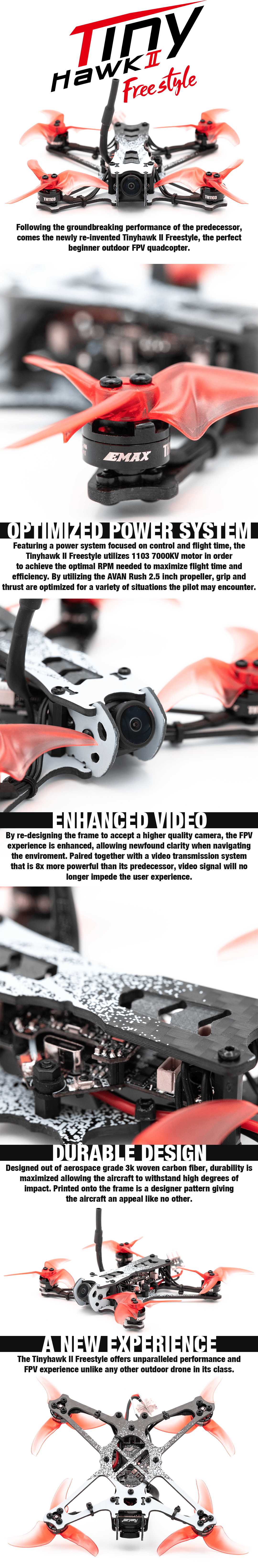 Following the groundbreaking performance of the predecessor, comes the newly re-invented Tinyhawk II Freestyle, the perfect beginner outdoor FPV quad!