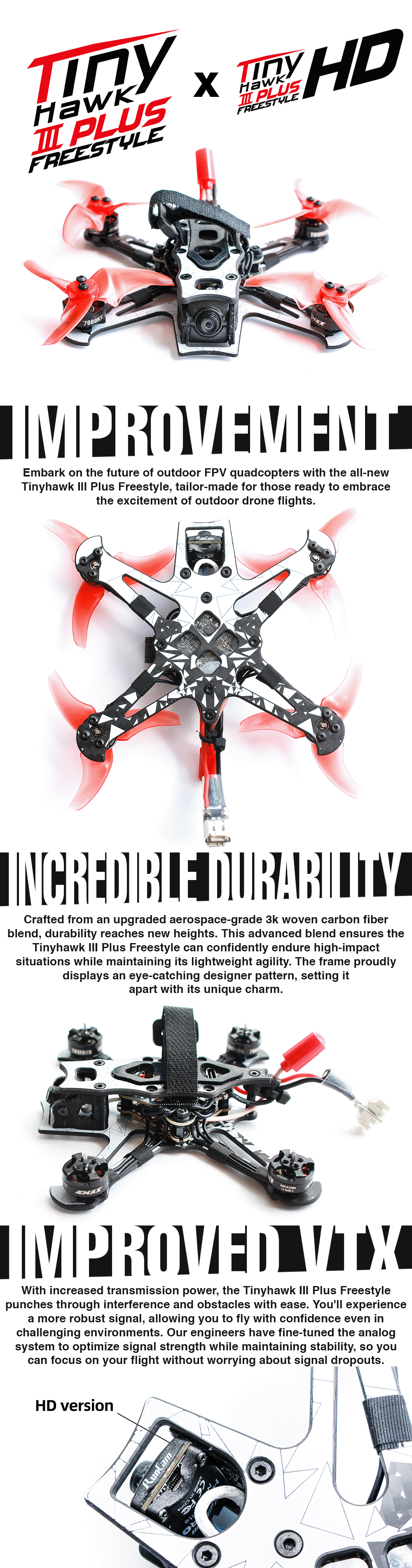 Ready to take outdoor FPV quadcopter flight to the next level? Embark on the future with the all-new Tiny Hawk 3 Plus Freestyle-- precision-engineered for extended airtime. It features a 1225 7000 KV motor and Avan Rush 2.5' propellers for exceptional grip and thrust. Durability is elevated with an upgraded 3K Carbon Fiber-blend frame.
