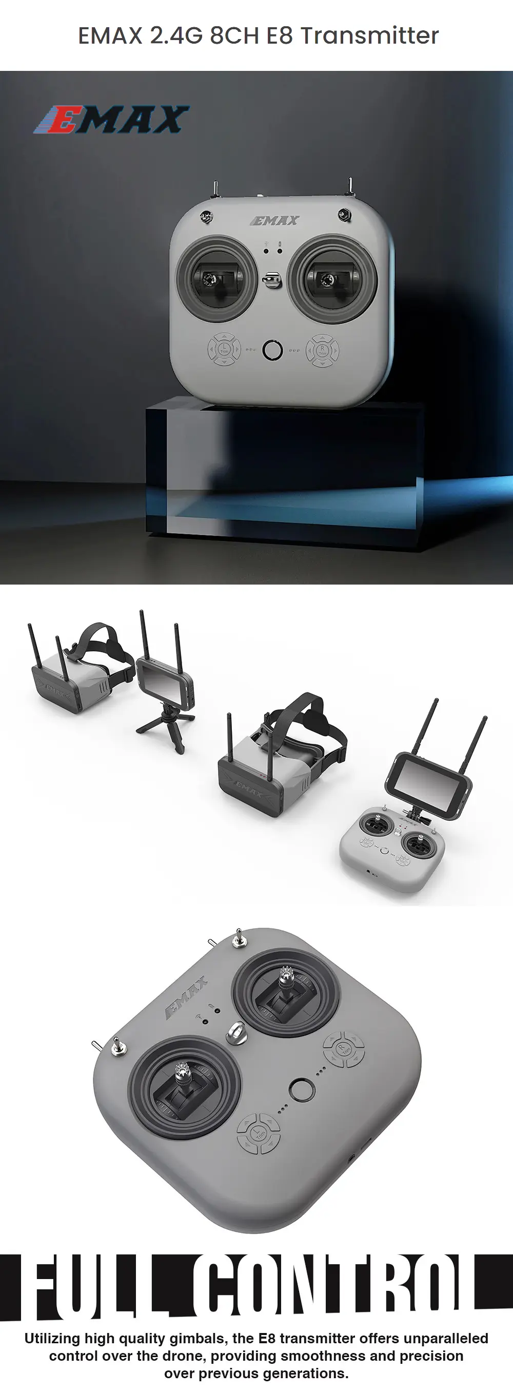 The EMAX E8 Transmitter features a built-in 2.4GHz dual-band antenna and an 8 channel RF Module. The built-in USB charging system is compatible with a 18650 battery with a working voltage of 3.3-4.3V. Right-hand and Left-hand modes make this transmitter the right fit for any pilot!