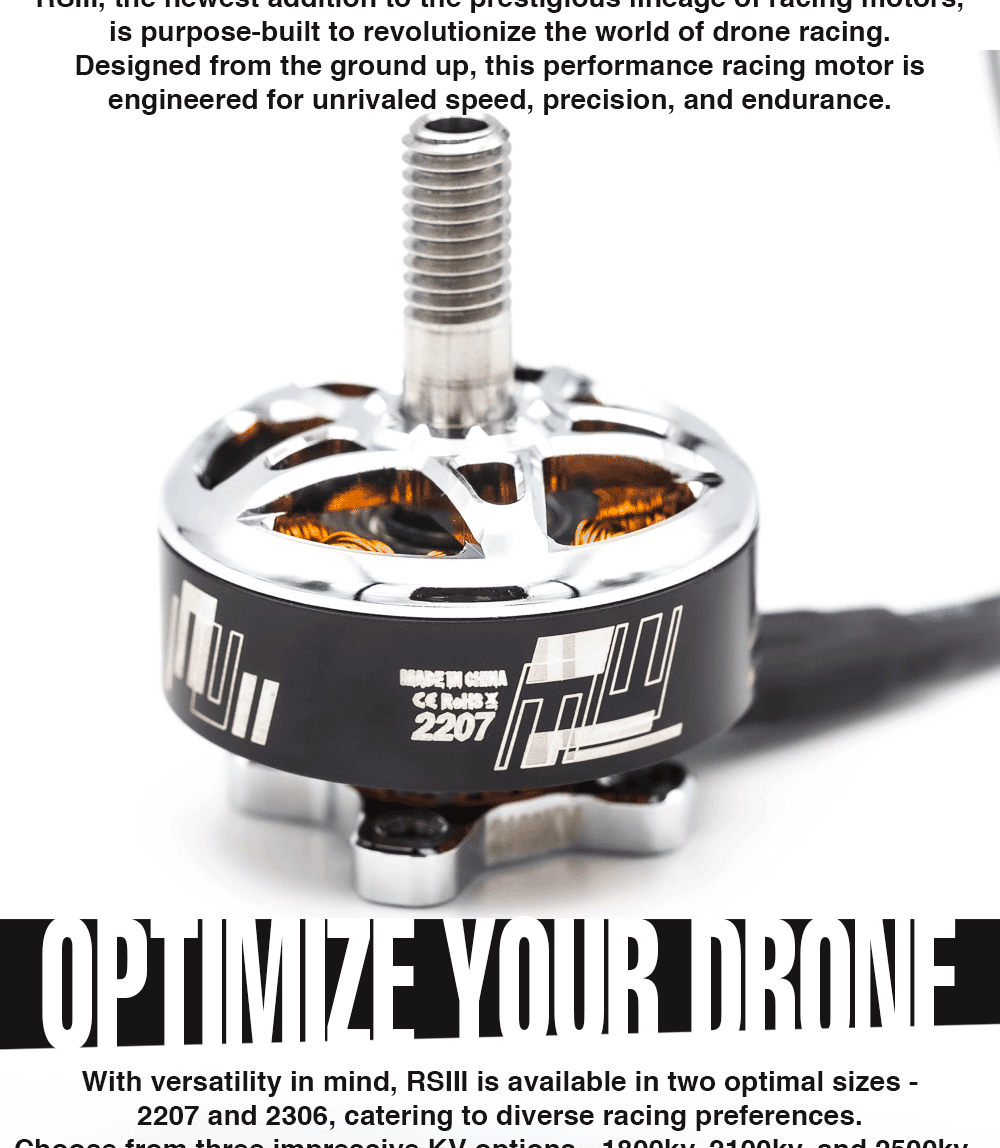 Behold the RS3 (Race Spec III) motor from EMAX—the perfect fusion of top-level performance and an affordable price point. Designed from the ground up for drone racing, the RSIII optimizes voltages up to 6S LiPOs, while its 4mm Titanium alloy bearing shaft ensures smooth and efficient rotations. Get ready to experience unimaginable speed, total precision, and unmatched endurance—the RSIII is ready to revolutionize the racing circuit!