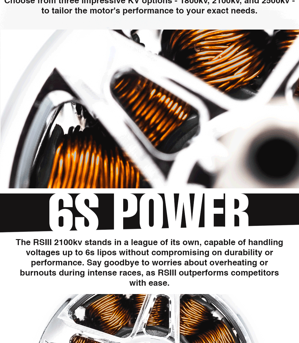- The RS3 has been under testing for the last 6 months with the fastest pilots on the planet to truly test the limits in terms of capability to withstand heat. The feedback from these pilots has been that the EMAX RS3 withstands excessive heat on 2100kv 6S without burning unlike any other motor they have tested to date.