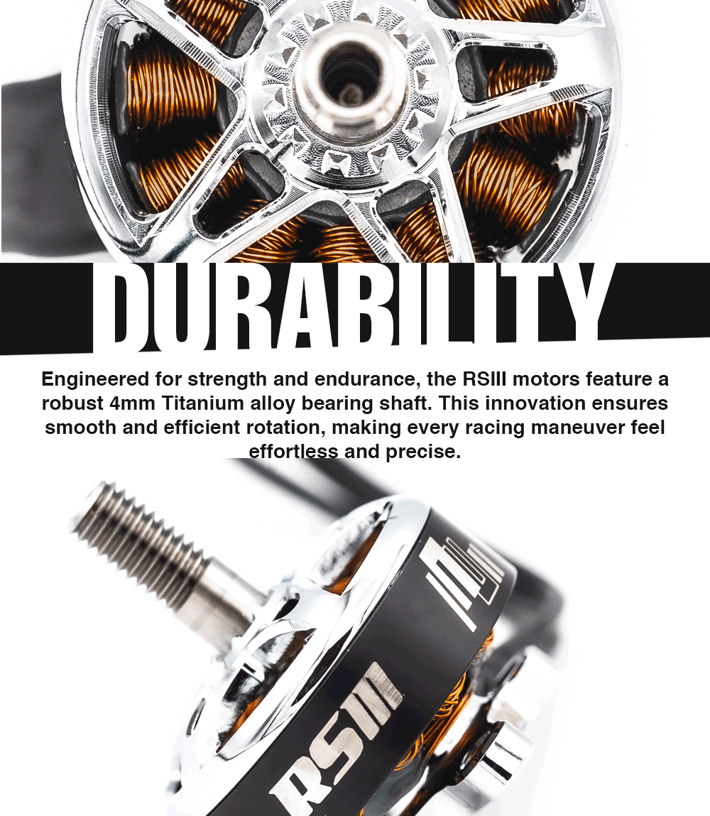 Behold the RS3 (Race Spec III) motor from EMAX—The perfect fusion of top-level performance and an affordable price point. Designed from the ground up for drone racing, the RSIII optimizes voltages up to 4S LiPOs, while its 4mm Titanium alloy bearing shaft ensures smooth and efficient rotations. Get ready to experience unimaginable speed, total precision, and unmatched endurance—The RSIII is ready to revolutionize the racing circuit!