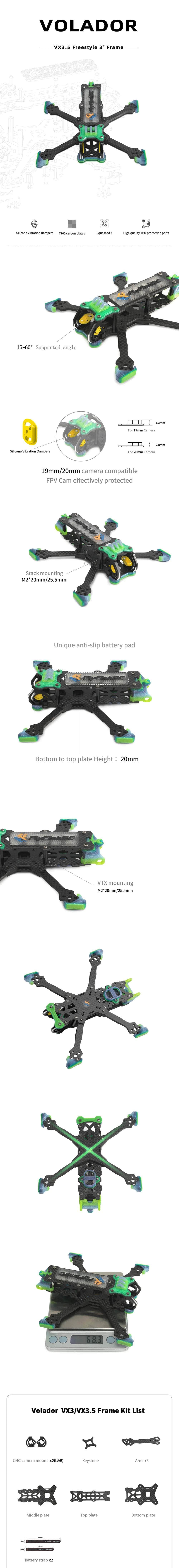 We are pleased to announce the birth of our Volador VX3.5 inch frame for FPV, this frame provides a 5-inch flying experience and is highly compatible and simple in their structural design. Necessary accessories are provided to make assembly easy, convenient, and organized.