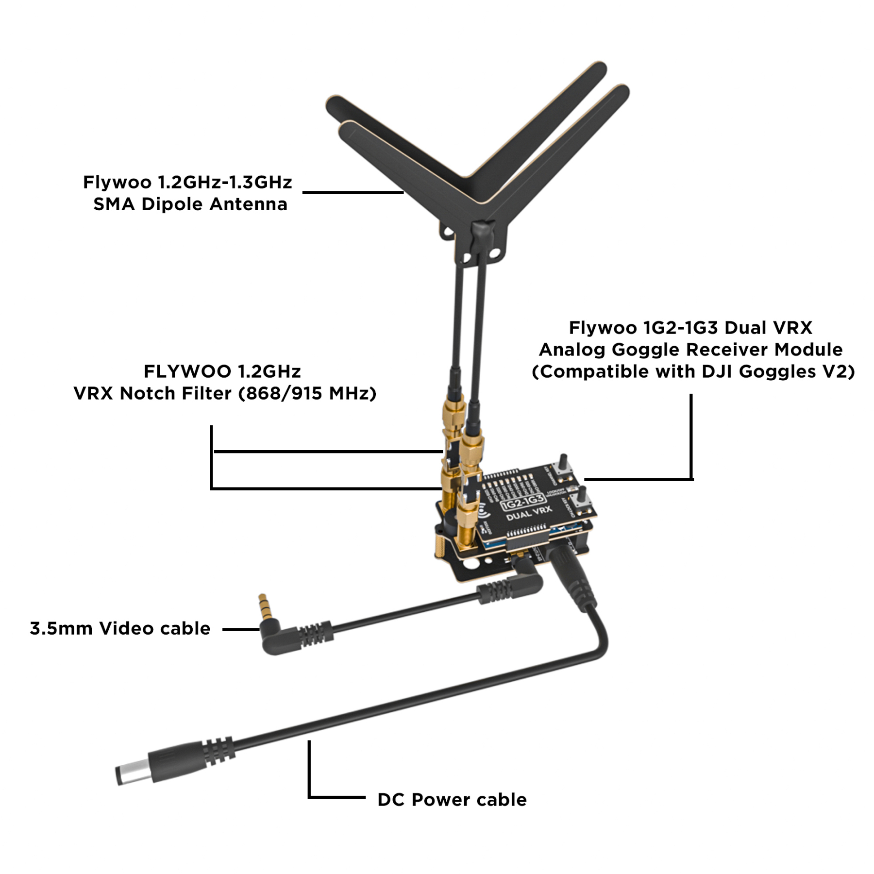 - 1x Flywoo VRX 1G2-1G3 Dual 9CH 1.2/1.3GHz Analog Goggle Receiver Module (Compatible with DJI Goggles V2)