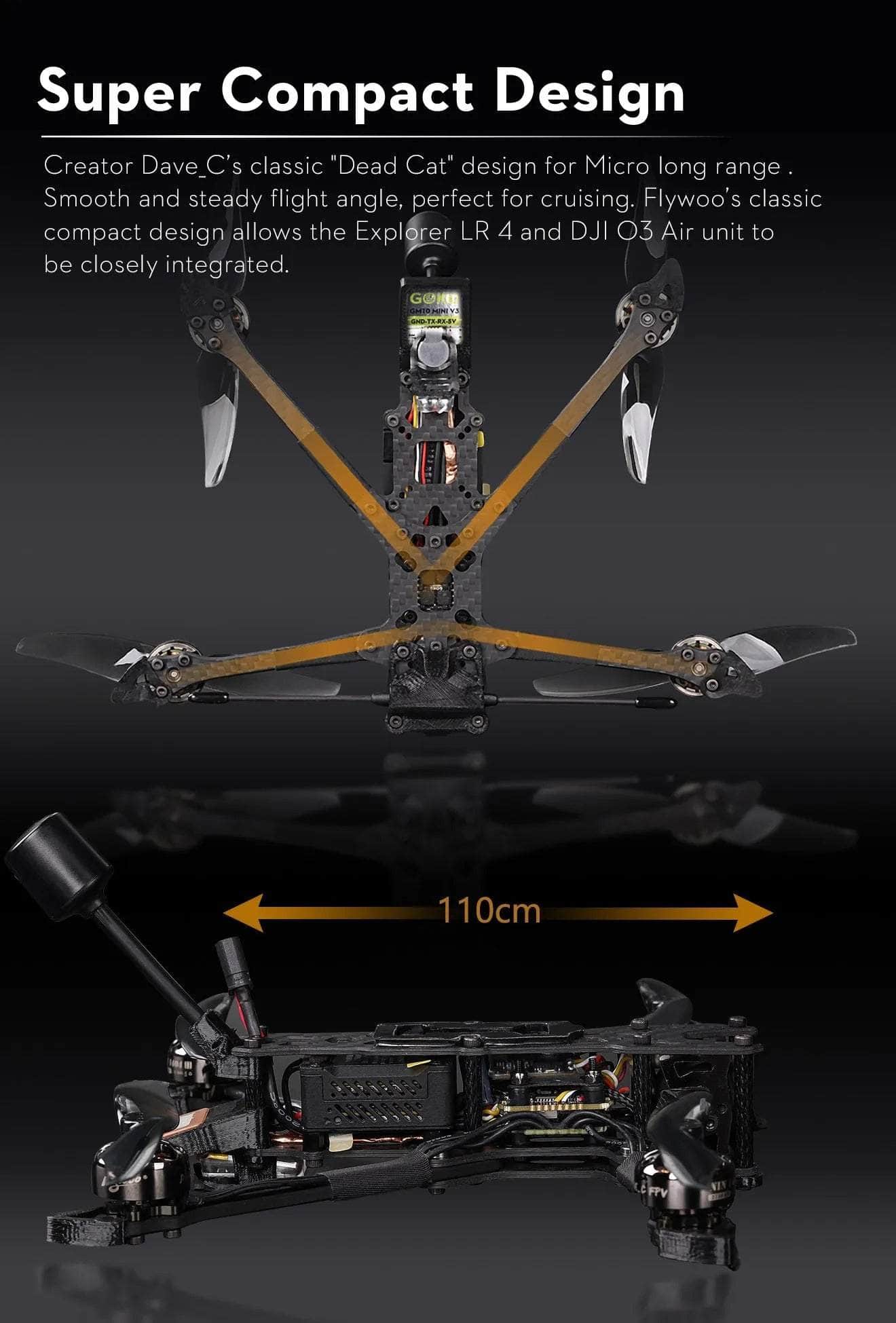From the creator of the classic dead cat design for micro long-range, Dave_C FPV. As well as the collaboration with Flywoo, we at RaceDayQuads present you the Flywoo Explorer LR HD. Small, long-range, lightweight, and a DJI O3 FPV Air Unit, now that is a recipe for fun. This quad features the GOKU Versatile F405 Pro Mini Stack, NIN 1404 V2 2750KV Motors, and V3.0 GPS.