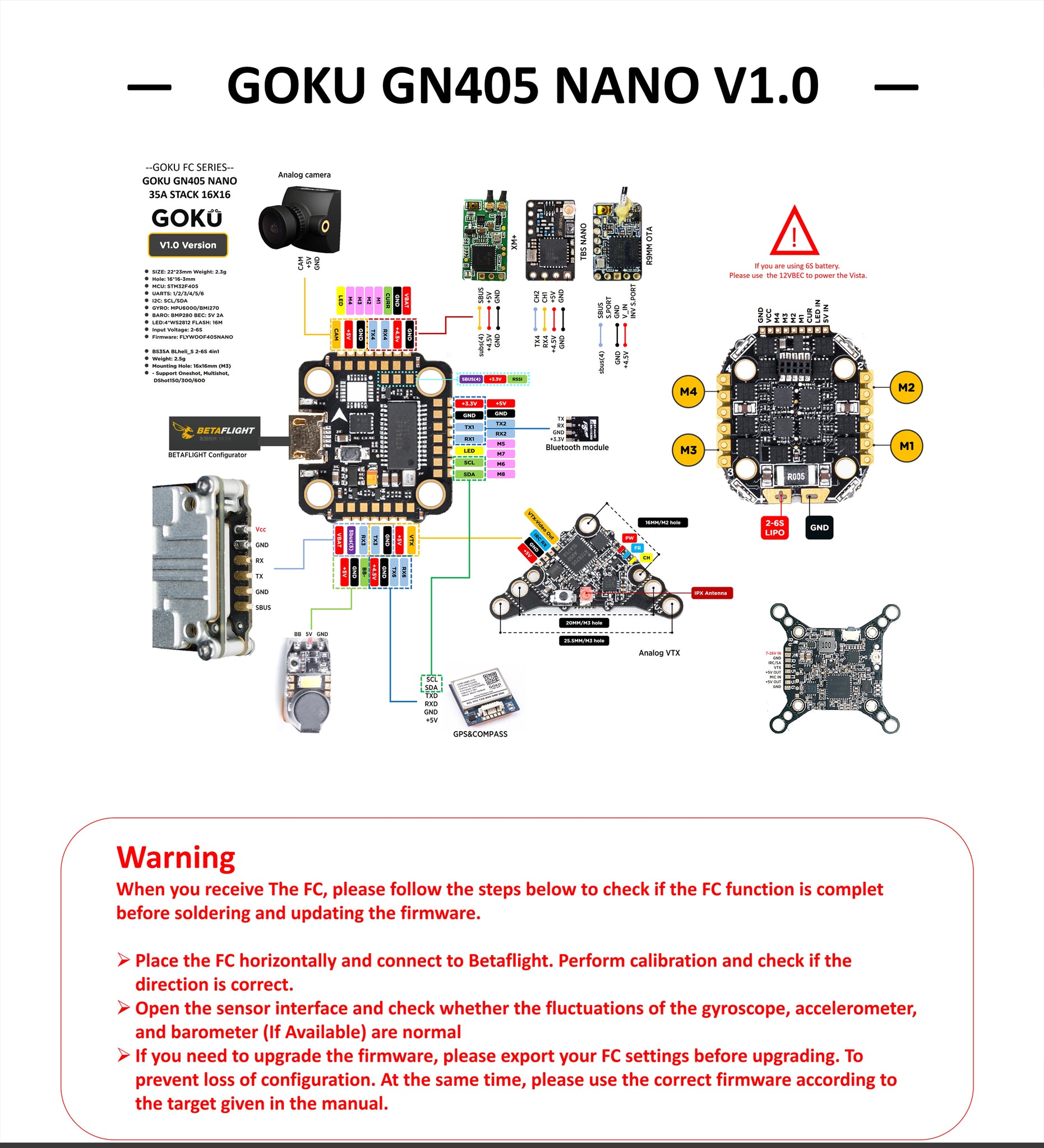 - 1x Flywoo GOKU GN405 F405 Nano 2-6S AIO 16x16 Flight Controller w/ 35A 8Bit 4in1 ESC