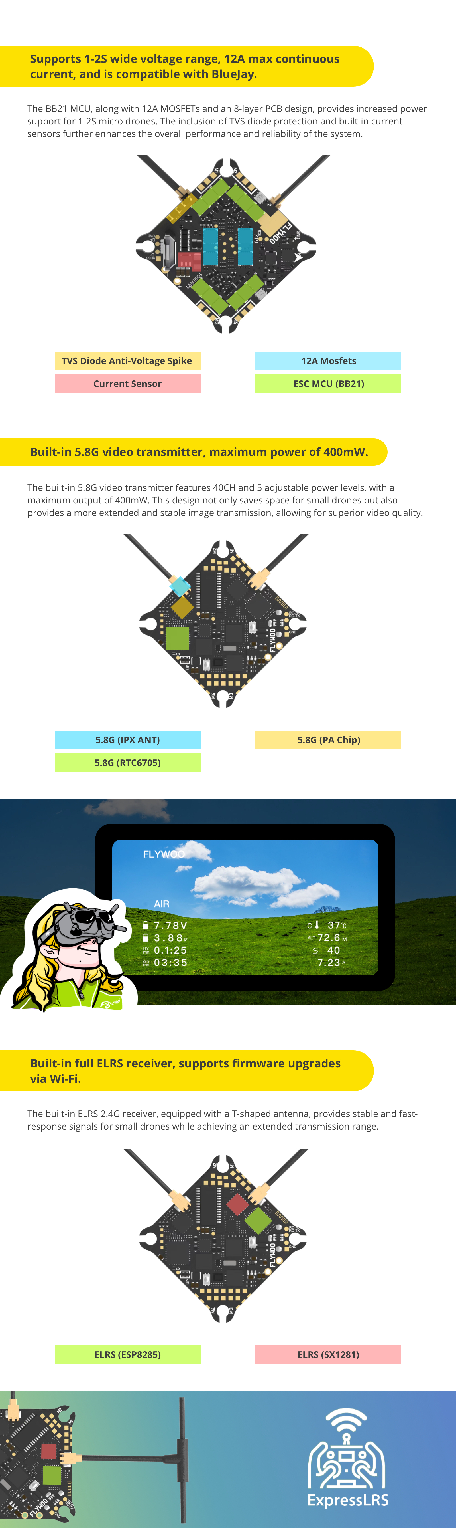 - Supports 12C compass input, providing accurate navigation and positioning capabilities ExpressLRS 2.4G· Built-in receiver (UART) with a lightweight design, convenient for WiFi upgrades.