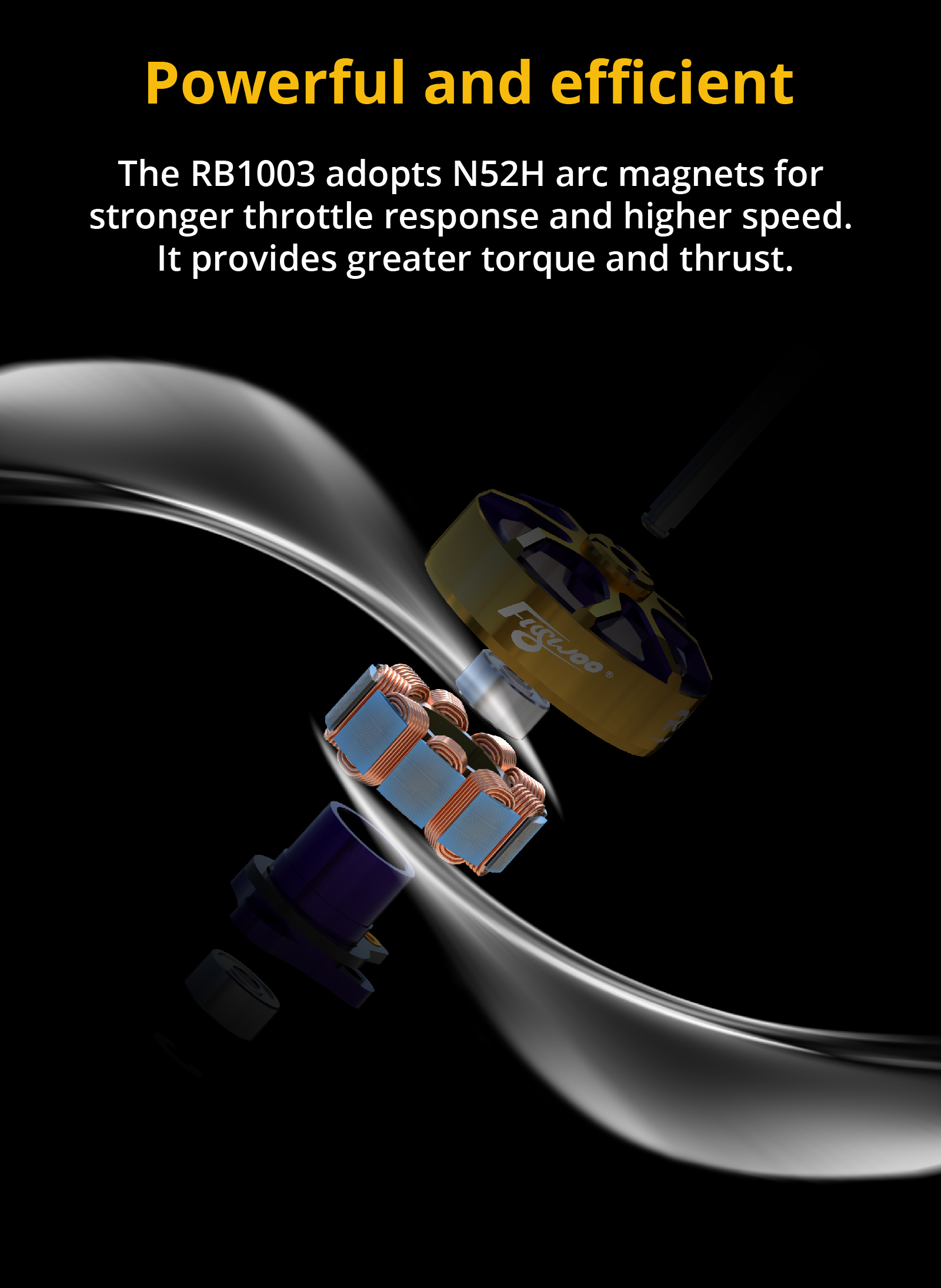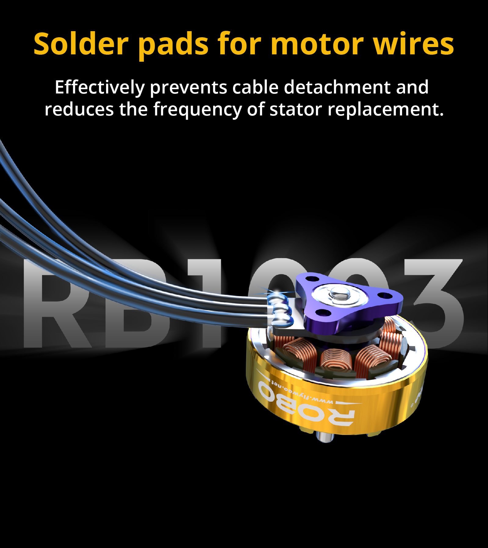 The Flywoo Robo 1003 motor provides an efficient power output and smooth operation in a lightweight package. It's constructed of top-grade 7075 aviation aluminum and boasts a dual bearing design, high-efficiency magnetic circuit design, dual color oxidation, and wire soldering pad for reliable control. It's an ideal choice for whoop and toothpick models.