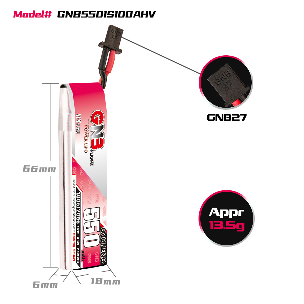 - 1x Gaoneng GNB 3.8V 1S 550mAh 100C LiHV Whoop/Micro Battery w/ Cabled - A30