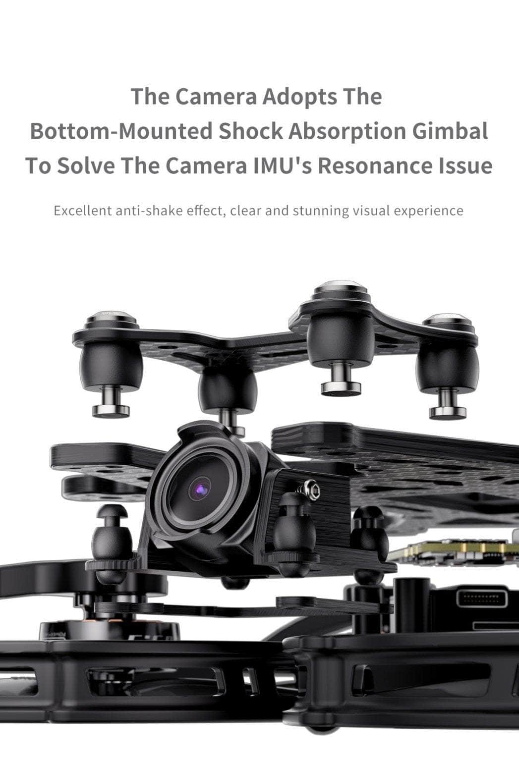 - For O3 camera design independent under hanging shock absorption gimbal, to solve the camera IMU resonance issues, to achieve the optimal anti-shake effect.