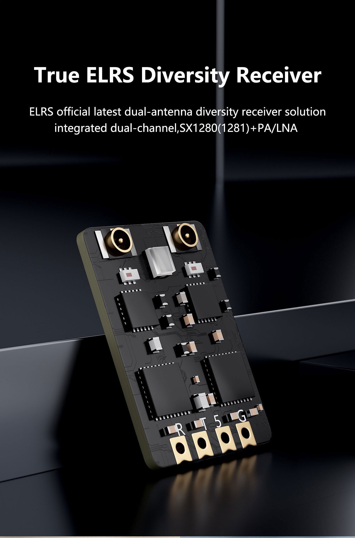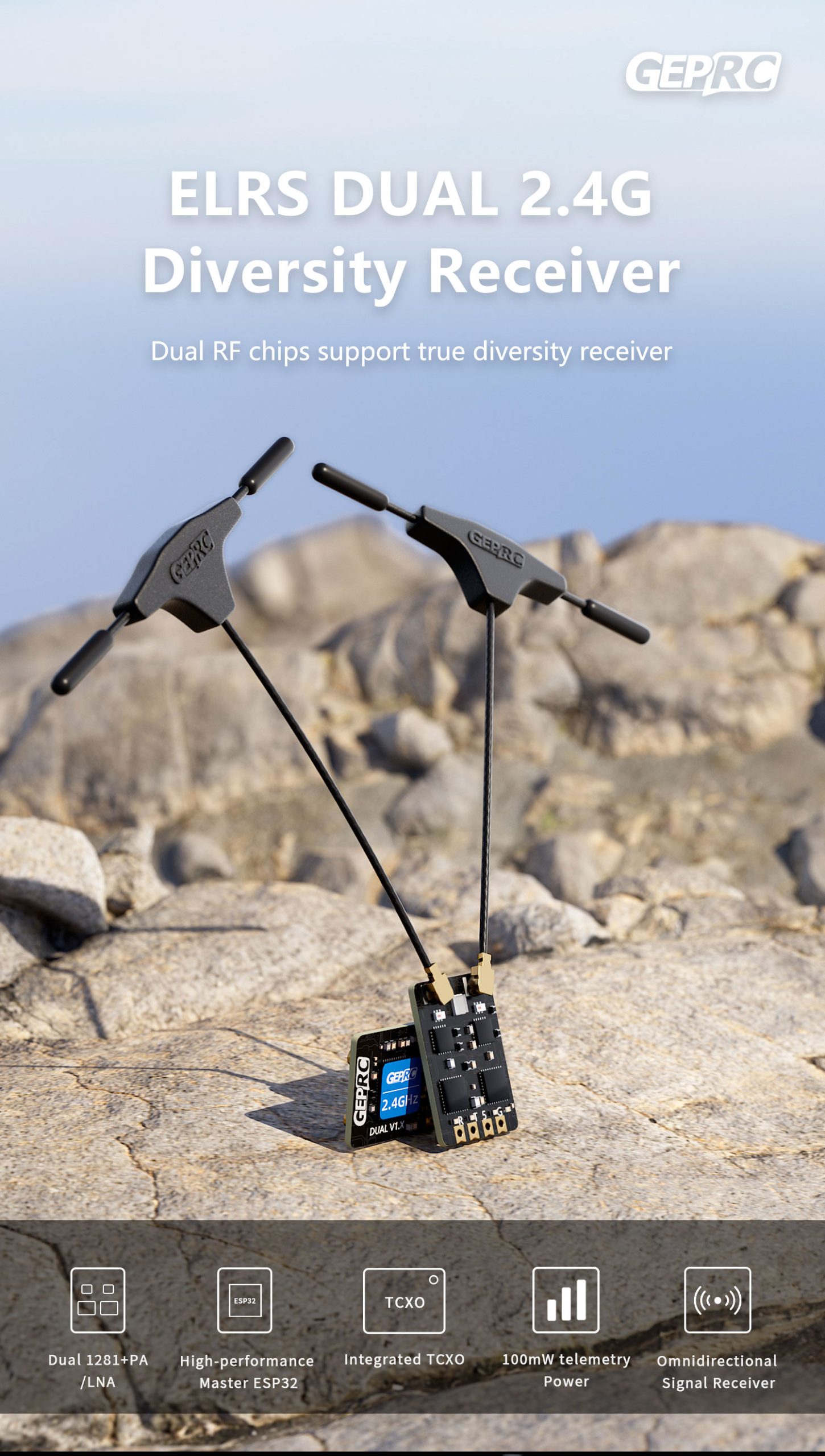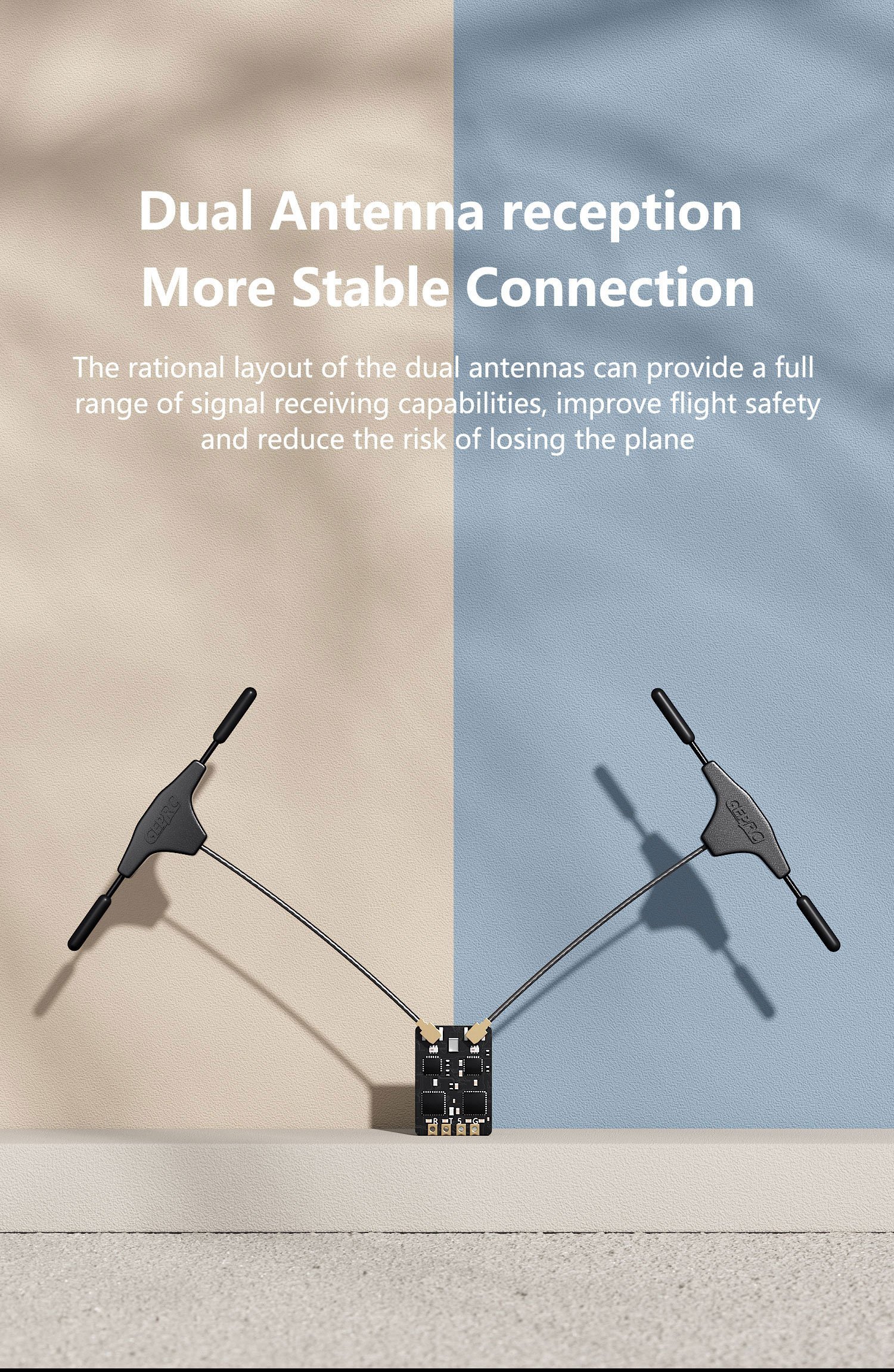 The ELRS DUAL 2.4G Diversity Receiver from GEPRC is a game-changing, dual-antenna system utilizing ExpressLRS open source tech. It offers exceptional coverage, low latency, and a fast refresh rate of 1000Hz, all at a budget-friendly price! With its optimal positioning of dual antennas, it offers far better signal reception and sturdier connection than most single-antenna setups. It uses a TCXO temperature-compensated crystal oscillator to avoid frequency shifts caused by temperature changes and the telemetry power is up to 100mW.