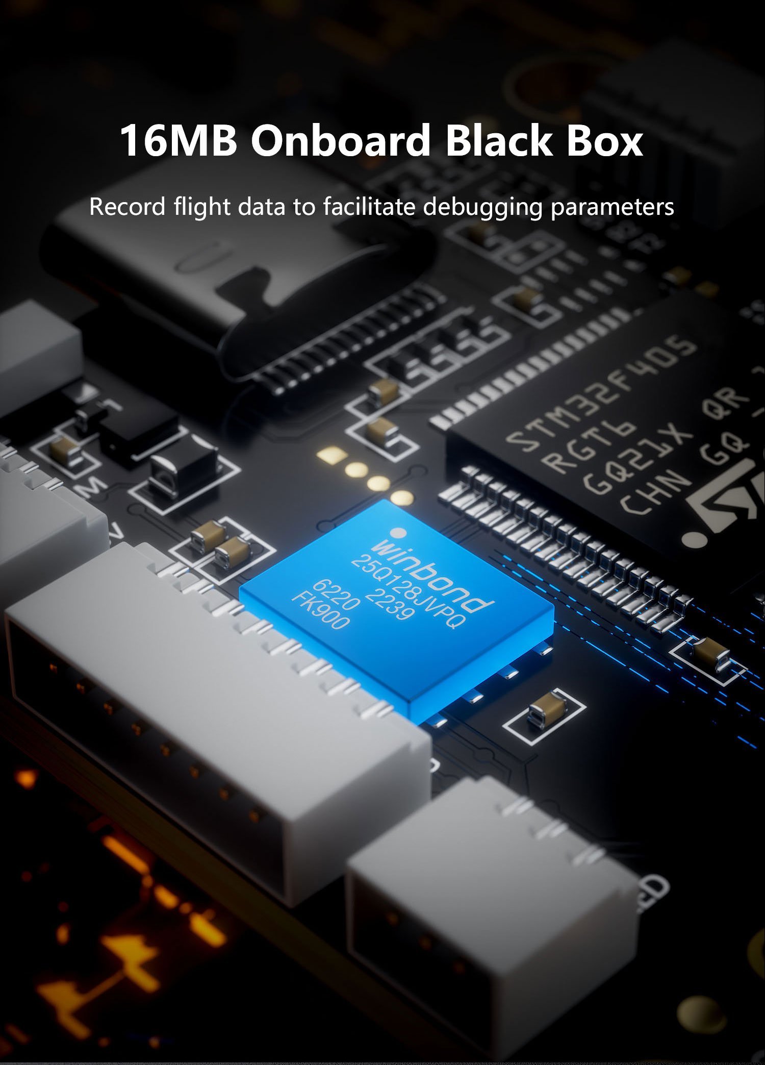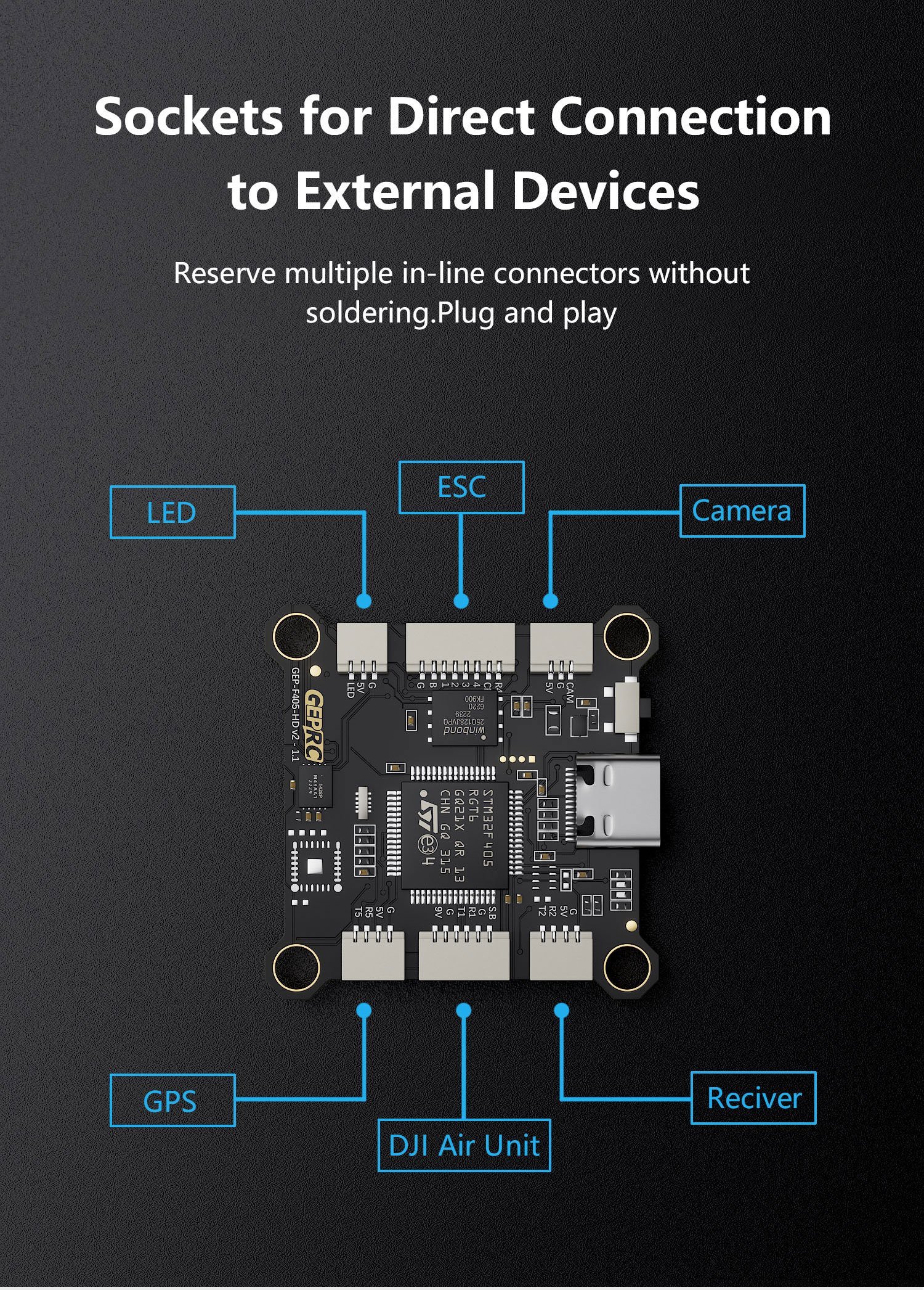 GEPRC TAKER F405 BLS 50A STACK is a plug-and-play stack system specially designed for DJI Air Unit. With the STM32F405 chip, ICM42688-P gyroscope, 16M black box and GEP-BLS50A-4IN1 ESC, you can enjoy a smooth and effortless user experience. This stack system connects to the DJI Air Unit with no soldering required, plus the upgraded Type-C USB connector increases the lifespan of the socket and reduces the risk of poor contact. The 9V 2.5A + 5V 3A dual independent BEC ensures a reliable power supply for any external device you might need.