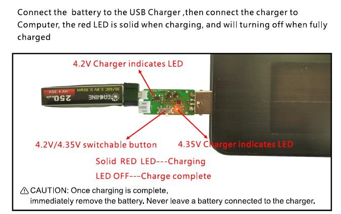 This convenient Happymodel USB Charger is tailored for a 200-400 mAh battery. It has an LED light to indicate when charging is complete, as well as a 4.2V/4.35V switchable button.