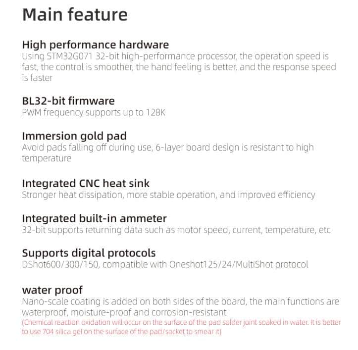 - Support protocols: Dshot600/300/150/Oneshot125/42, MultiShot