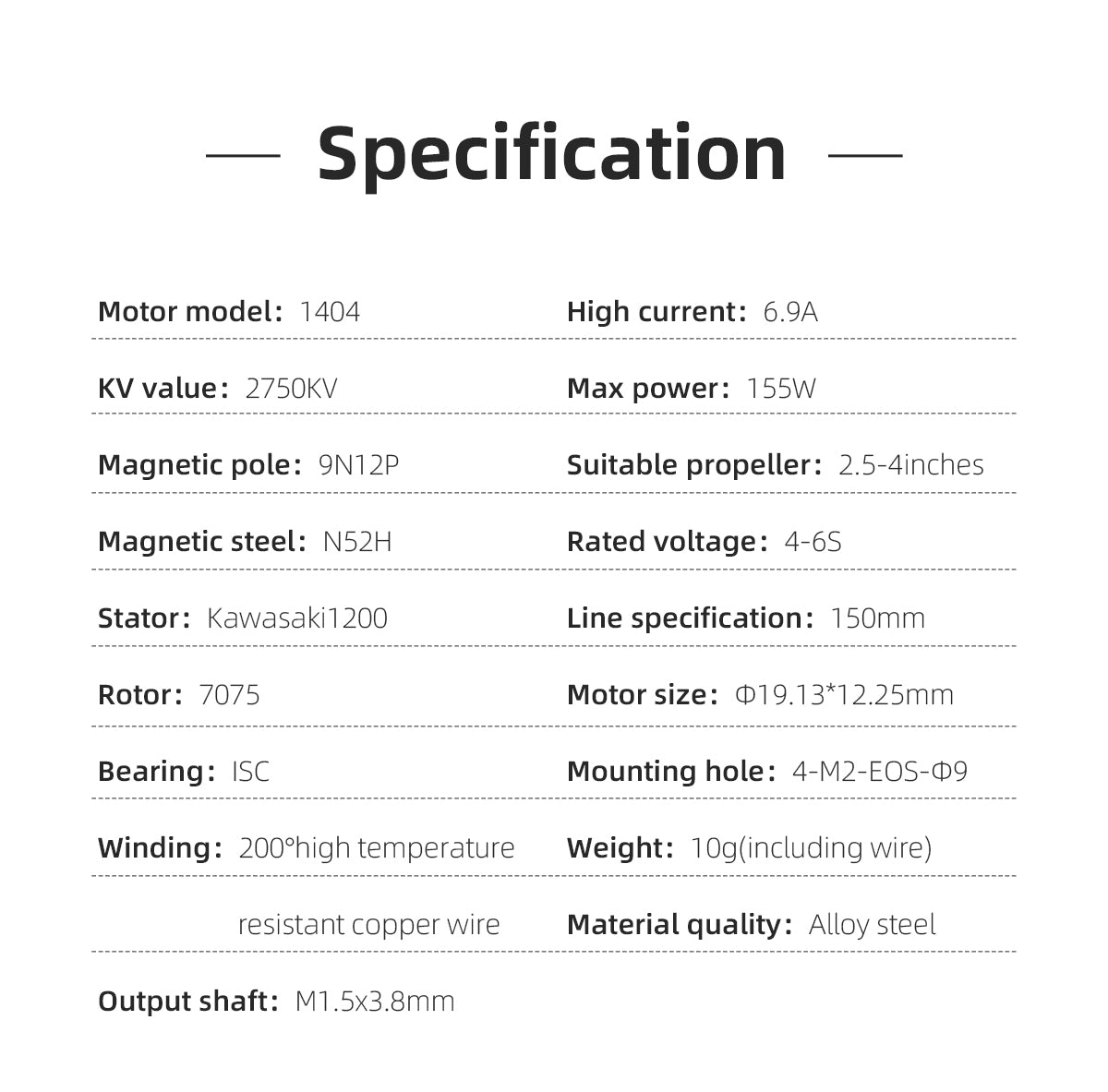 HGLRC SPECTER 1404 2750Kv Micro Motor is a powerful, efficient, and lightweight motor perfect for your micro quadcopter. Its high Kv value allows for faster acceleration and quicker response time, ensuring you experience agile and precise maneuvers. Upgrade your micro quadcopter today and enjoy the benefits of smooth, high-performance flight.