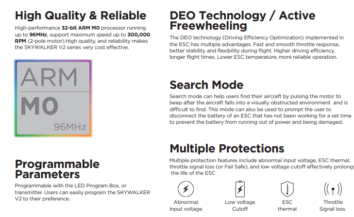 - Safety arming feature: Regardless the throttle stick position, the motor will not spin after battery connected