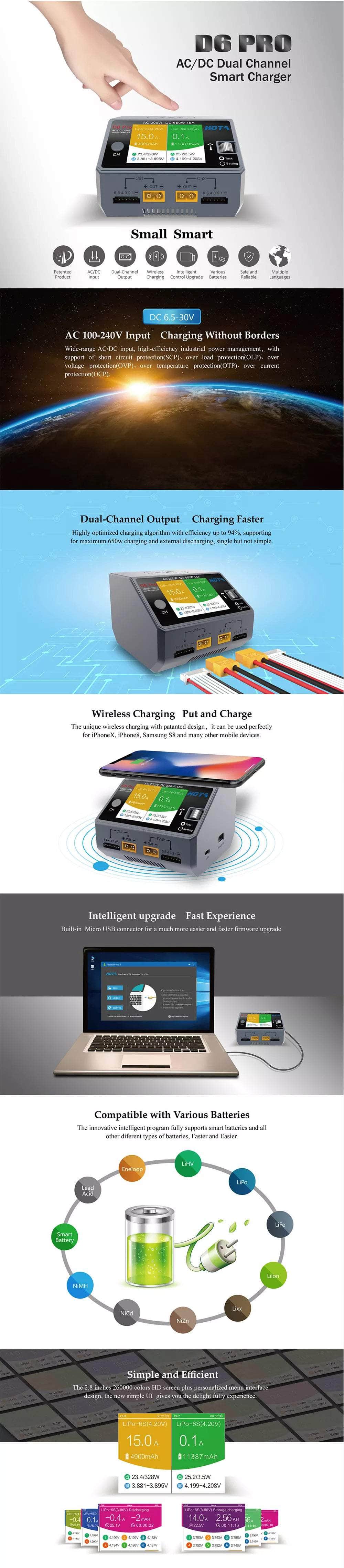 The HOTA D6 Pro supports 2 channels of 325W charging and features a highly optimized charging algorithm with efficiency up to 94%. The Pro model has all the features of the D6 with the addition of an AC input! This charger does it all, without over complicating things. It's easy to configure with a clear color LCD and Speed Shuttle Key interface, and has the added bonus of a 5V USB port AND Wireless charging on the top panel. Quickly and easily charge your iPhone, Samsung S8 and other wireless charging compatible mobile devices.