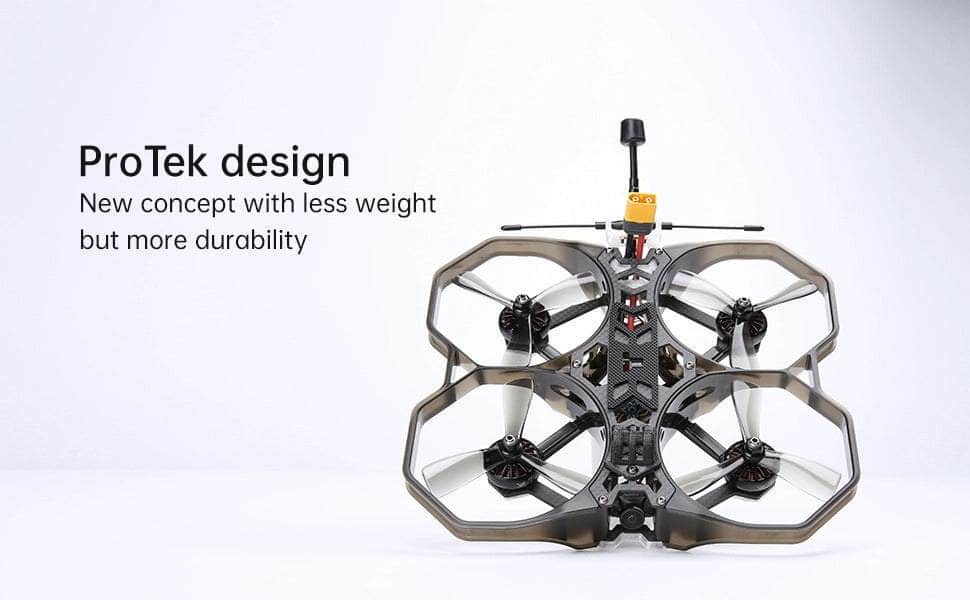 ProTek is not necessarily just a Cinewhoop series but far more. Equipped with our all-new 2205 motors for more power and less heat. We were able to increase speed and thrust by 50% compared to its 3inch predecessor which gives a lot more room for a lot more fun. Our GPS-measured maximum speed was above 120km/h and a maximum thrust of 750g per motor (3kg in total) would even carry heavier cams than a Gopro but also do some loaded punch-outs or light freestyle moves.