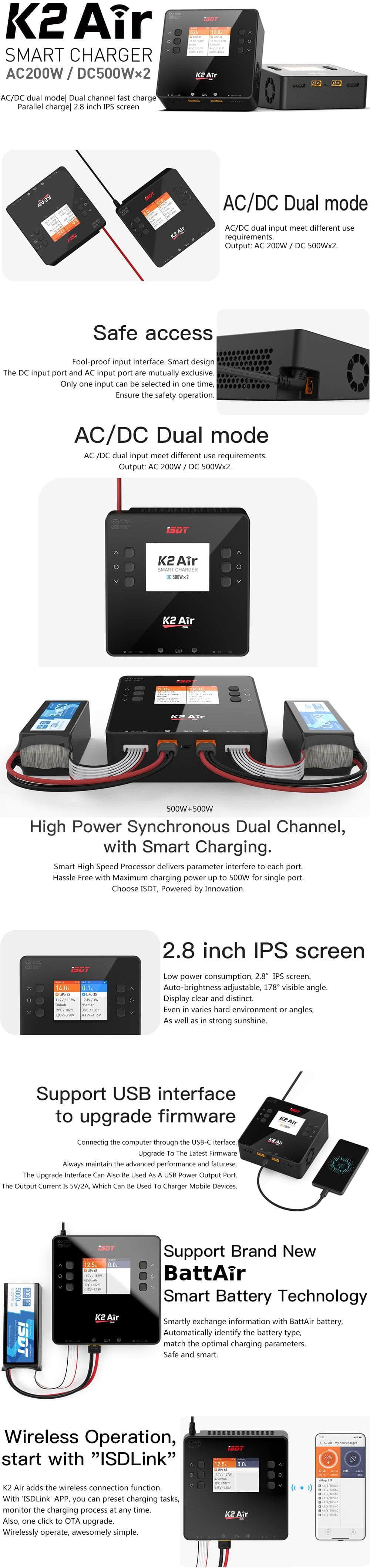 - 1x ISDT K2 Air 200/500W 20A 1-6S AC/DC Dual Channel AC Smart Charger