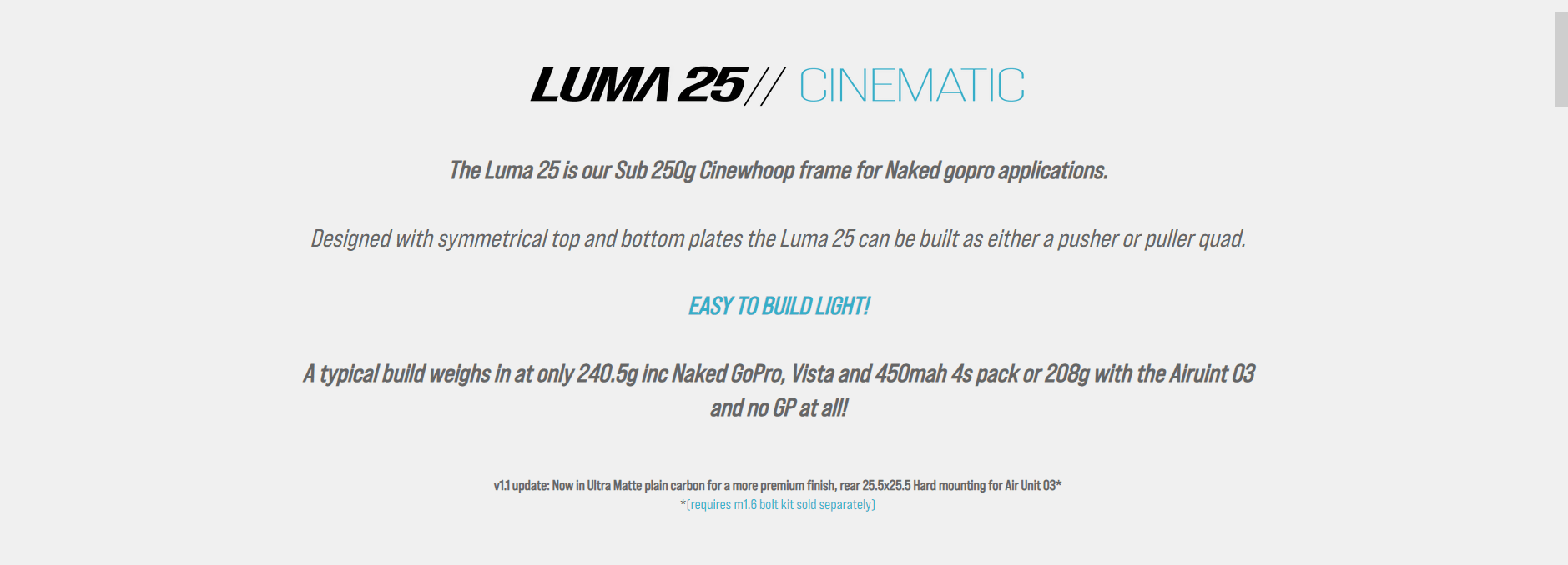 - 1x Luma Quads Luma 25 Cinewhoop 2.5' Micro Frame Kit