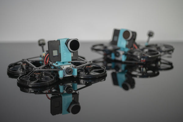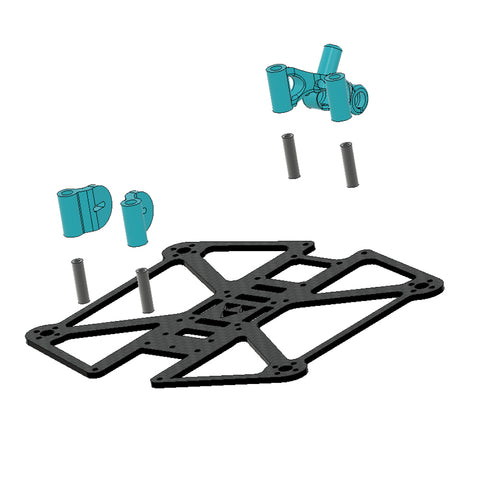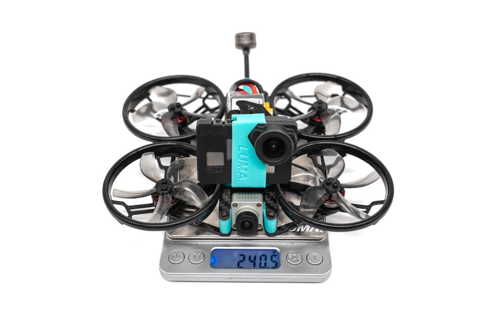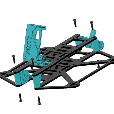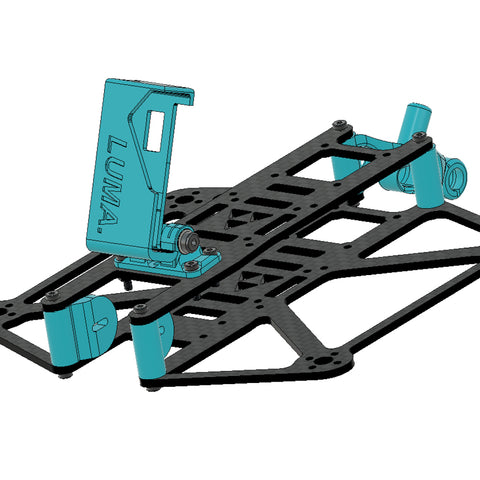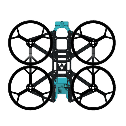 The Luma 25 Frame Kit from Luma Quads is designed for Naked GoPro applications. This modern-designed frame features symmetrical top and bottom plates, where you can be built as a pusher or puller quad. You'll love how light and easy to assemble this kit is, at only 240.5g with a Naked GoPro, Vista, and a 450mah 4S pack, or 208g with an Air unit O3 and no GoPro! A solid frame for those looking to create a 2.5' Cinewhoop! This version comes with black ducts and blue tpu.