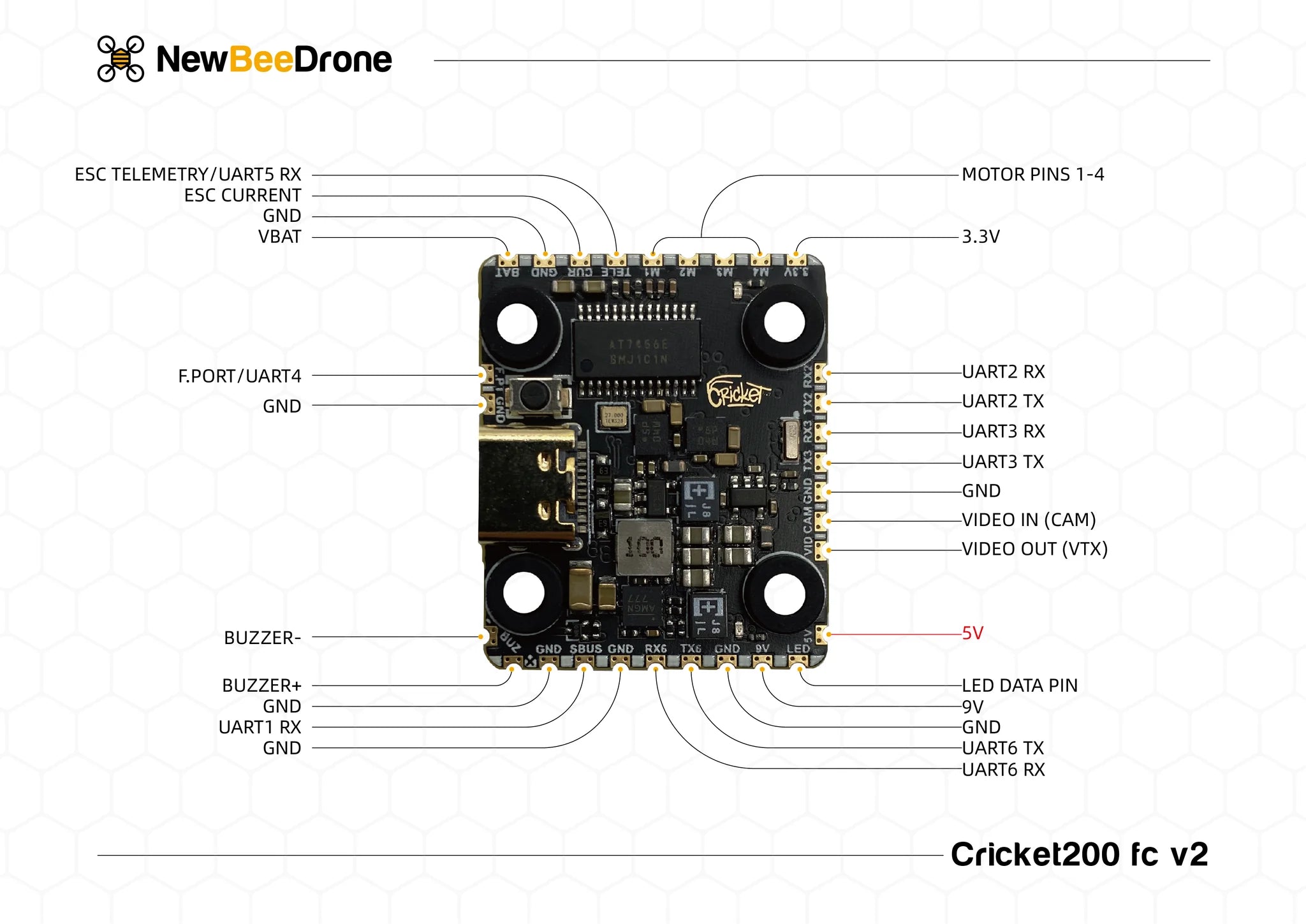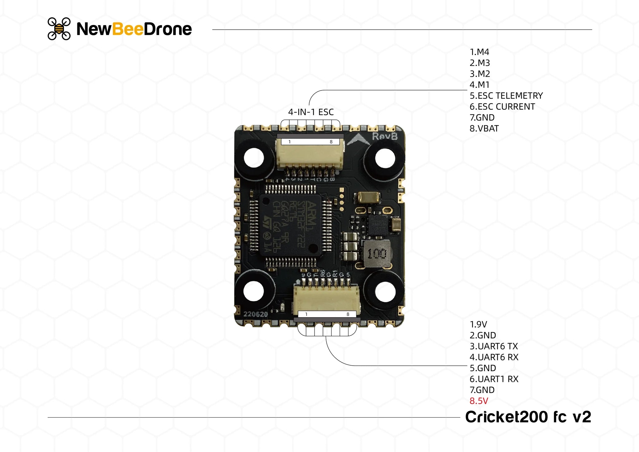 - 1x NewBeeDrone Cricket200 V2 F722 3-6S 20x20 Dual BMI270 Flight Controller