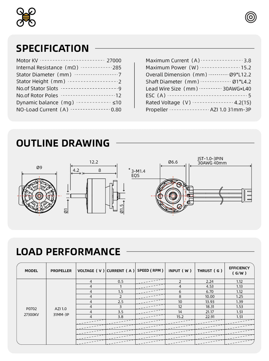 One of the standout features of this motor is its incredibly lightweight design. Without cables, it weighs only 1.38g, while with cables and plugs, it weighs a mere 1.58g. This makes it one of the lightest motors on the market, giving you a significant advantage in Whoop racing.