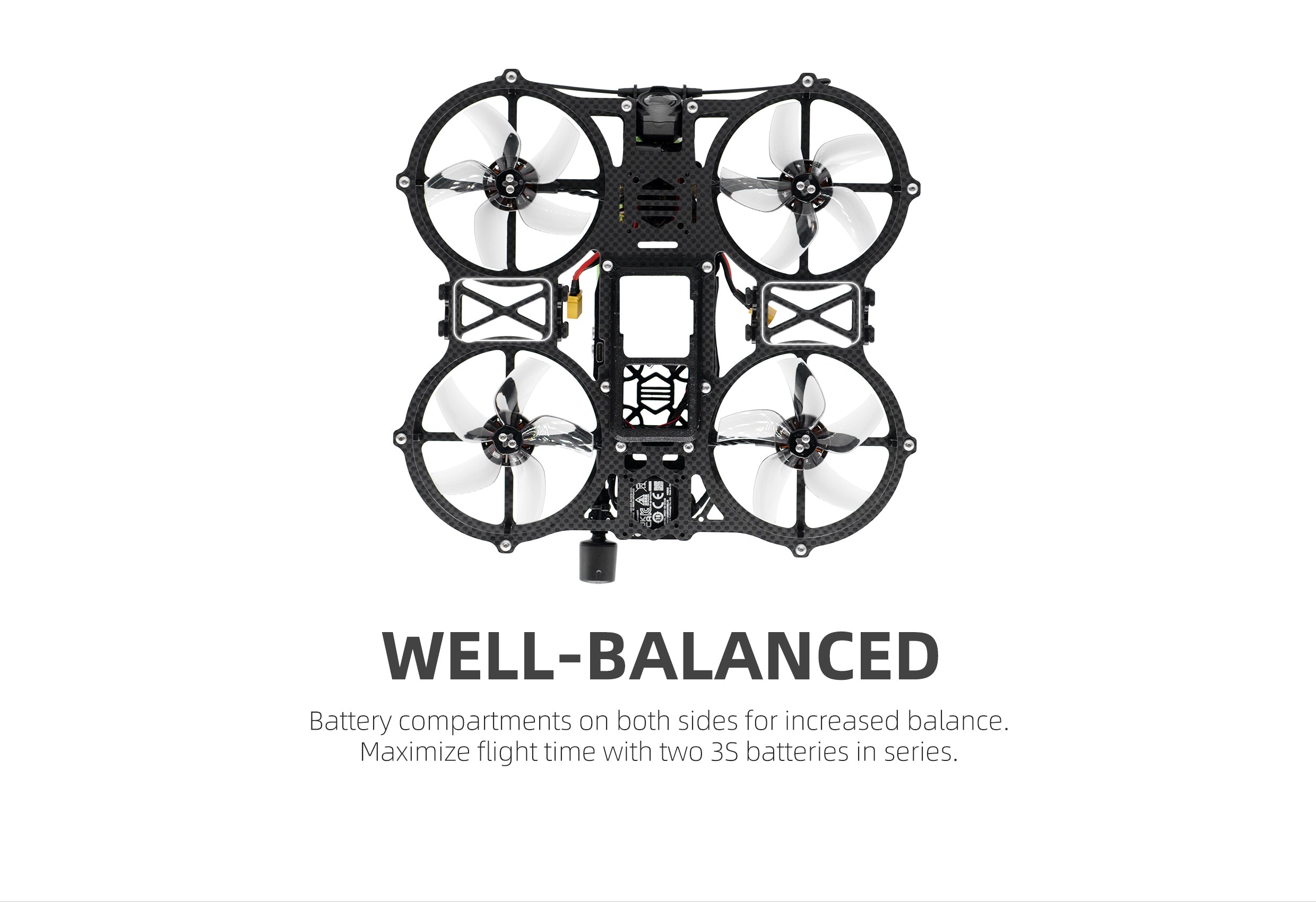 A unique two-battery mounting configuration perfectly balances the center gravity and keeps it in line with the props unlike a top or bottom mounted battery.