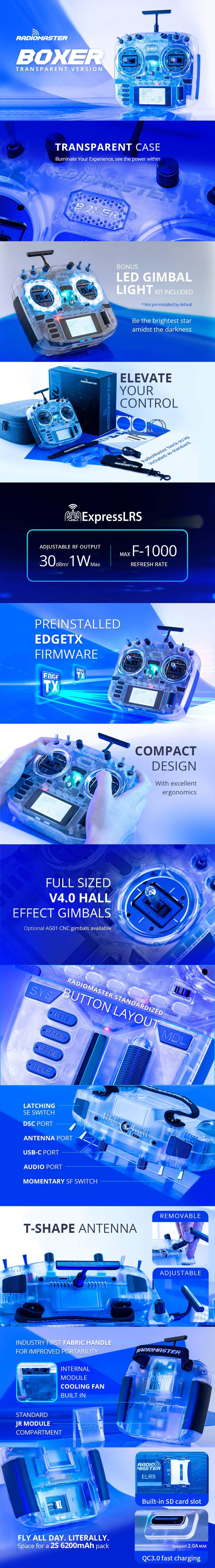 The perfect combination of size and ergonomics make the Boxer an ideal choice for pilots on the go. Featuring full-size hall gimbals for precision control and an intuitive button layout, the Boxer gives you a compact radio without compromising on comfort and function. This version comes with a transparent case and a bonus white LED kit for your gimbles, a great combo for a classy looking transmitter.