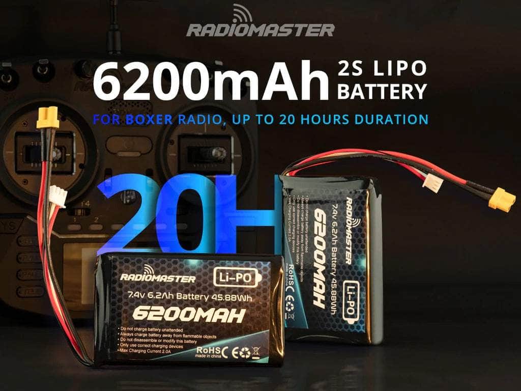 The RadioMaster 6200mAh 2s Li-Po battery pack is the perfect battery for your RadioMaster Boxer transmitter. The RadioMaster 6200mAh pack offers convenience and peace of mind when looking for a battery that will work for hours.