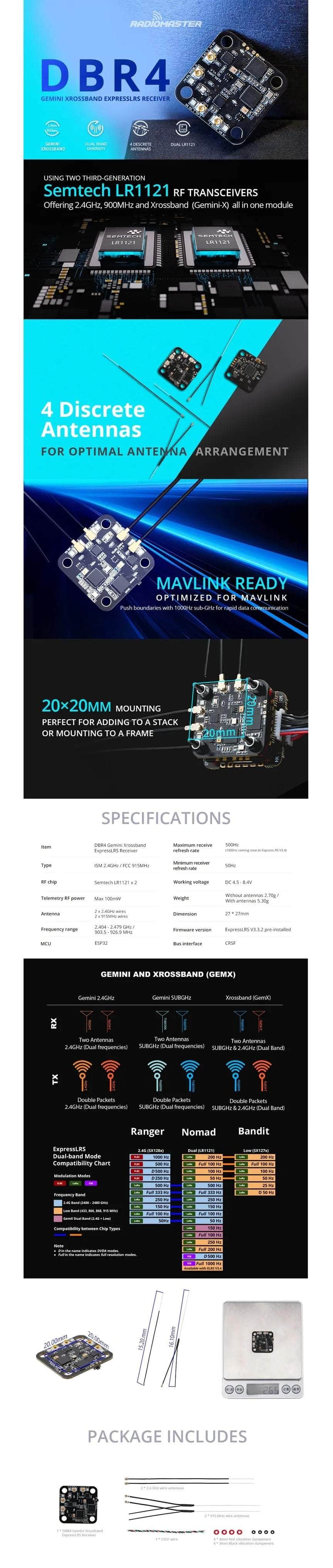- 1x RadioMaster DBR4 Dual-Band Xross Gemini ExpressLRS Receiver