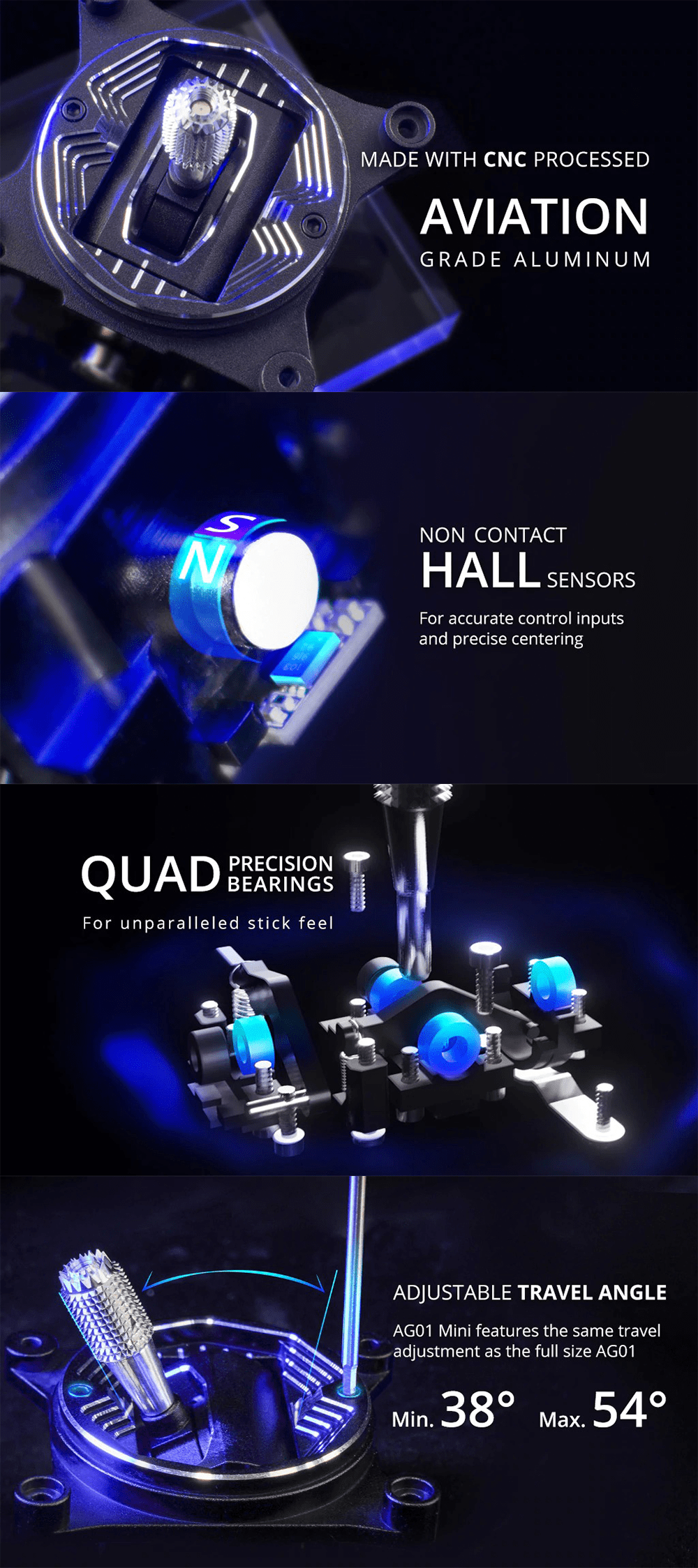 RadioMaster Mini CNC AG01 Hall Gimbal Set for Zorro & TX12 was designed and tested for over a year. The AG01 is fully CNC milled for ultimate precision with quad ball bearings for a smooth and precise feel. Featuring front-accessible tension and travel adjustment for easy fine-tuning. The Mini AG01 will take your TX12 or Zorro to the next level.