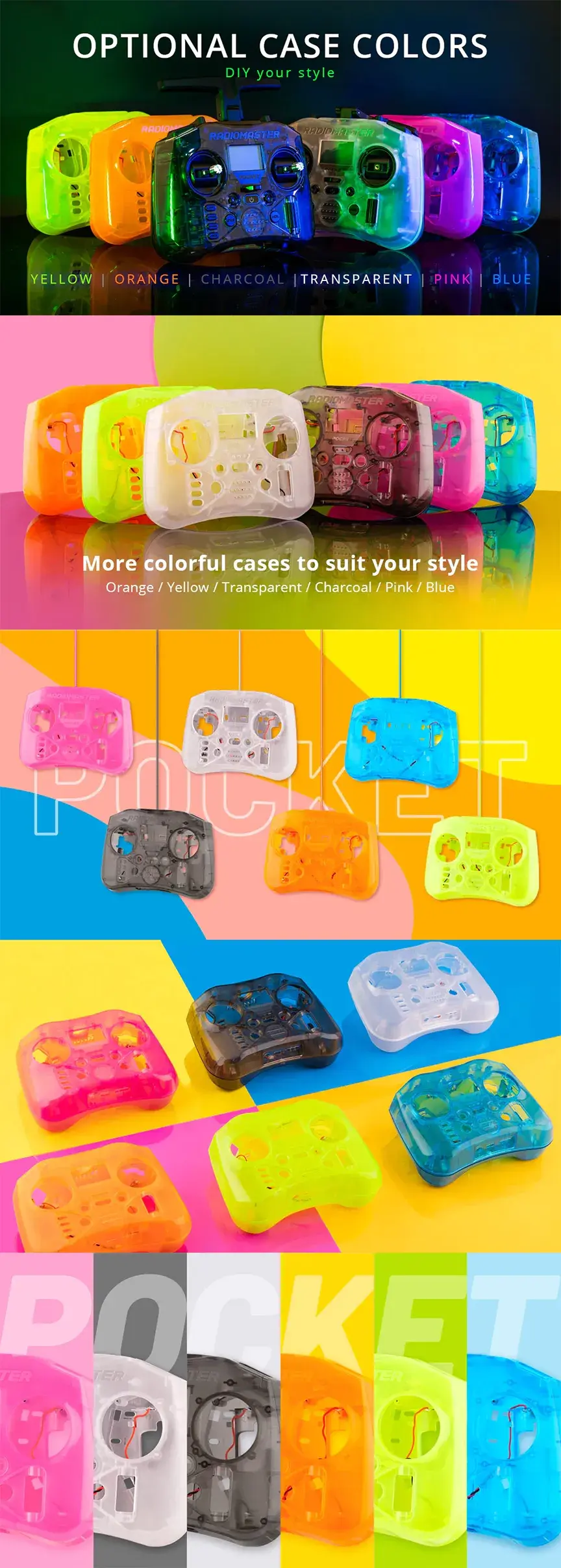 A colored replacement case for the RadioMaster Pocket EdgeTX RC Transmitter.