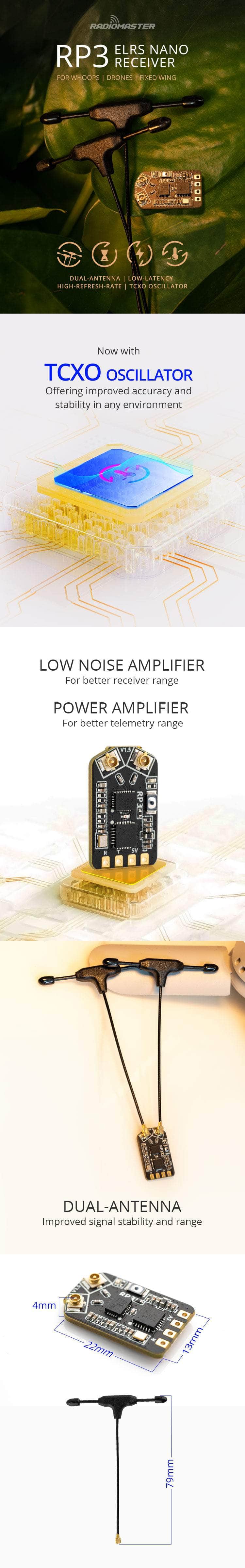 It is equipped with and a TCXO oscillator for solid connection & reliability. Developed around the ESP8285 MCU and SX1280IMLTRT RF Chip the RP series offer Lora and FLRC 2.4ghz RF links offering incredible range and low latency. With Wifi built-in, firmware updates can be done on your craft without the need to remove the receiver. Binding can be done using a bind phrase meaning no more bind plugs or fiddly button presses while trying to plug in your battery.