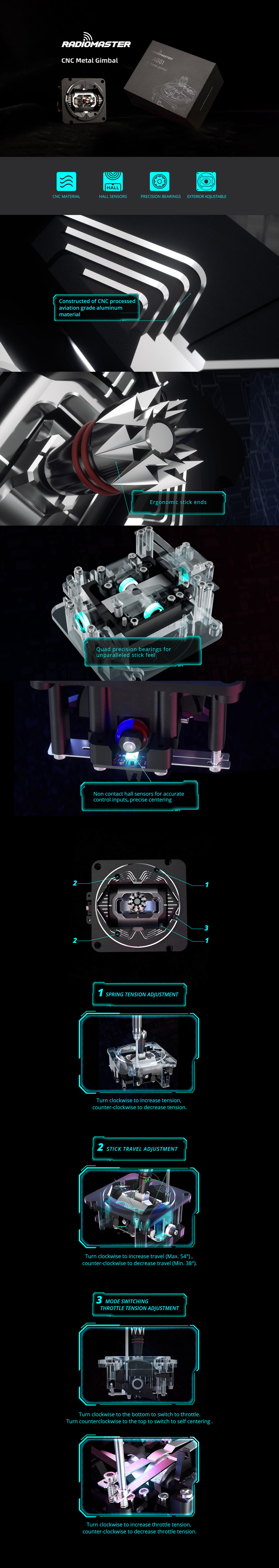 This Radiomaster AG01 Full CNC Hall Gimbal Set was designed and tested for over a year. The AG01 is fully CNC milled for ultimate precision with quad ball bearings for a smooth and precise feel. Featuring front-accessible tension and travel adjustment for easy fine-tuning. The AG01 will take your TX16s to the next level.