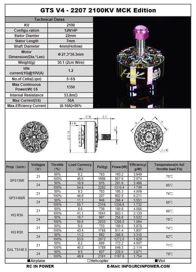 - 1x RCinPOWER MCK GTS V4 2207 2100Kv Motor