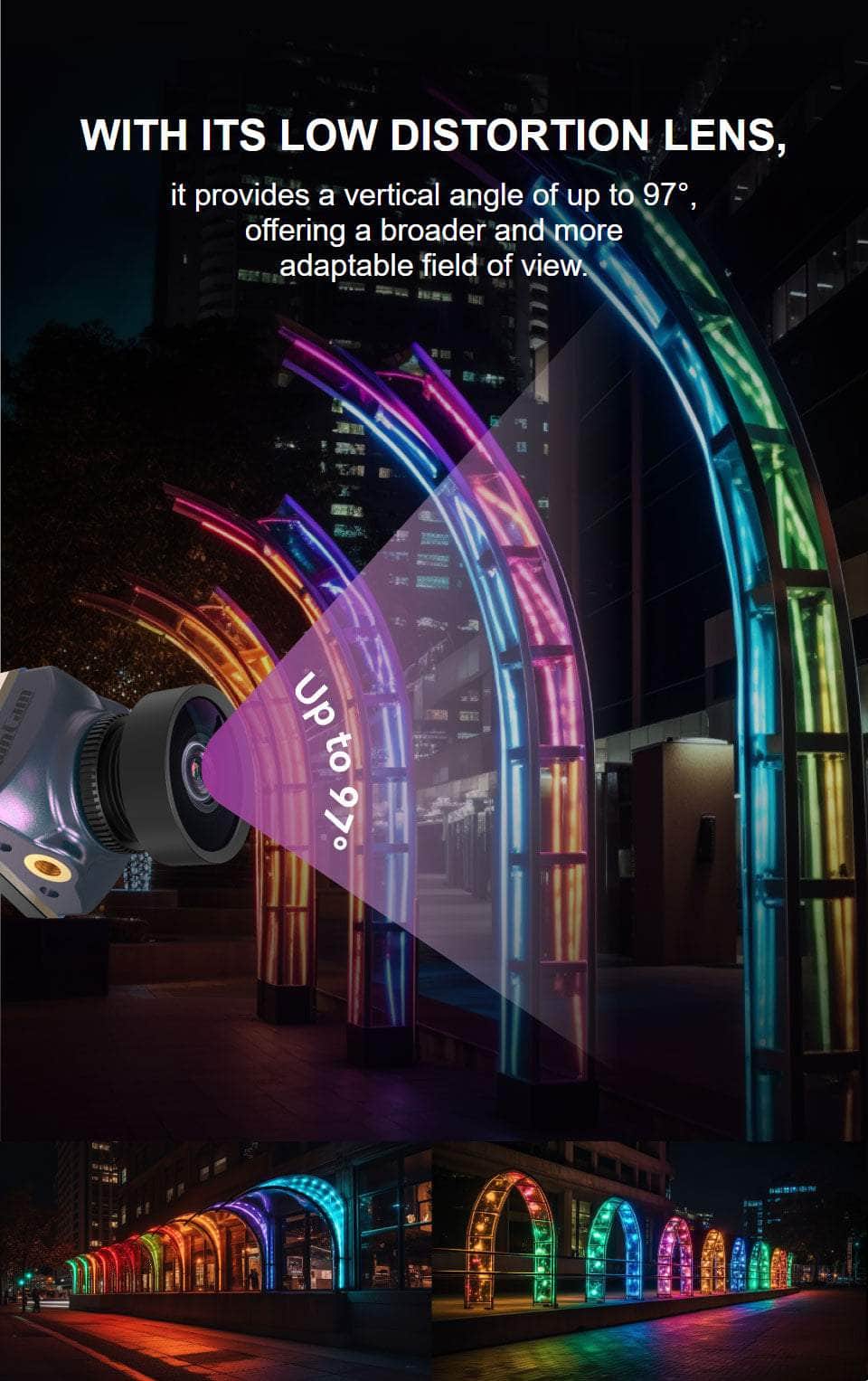 The latest RunCam Racer Nano 4 delivers outstanding clarity, an incredible FOV, top-notch WDR (6ms latency), and amazing compatibility with OLED goggles! Noise is vastly reduced, and colors are perfectly adjusted for a more realistic look! This camera comes with a low-distortion lens, providing a vertical angle of up to 97°, which allows for a broader and more adaptable field of view.