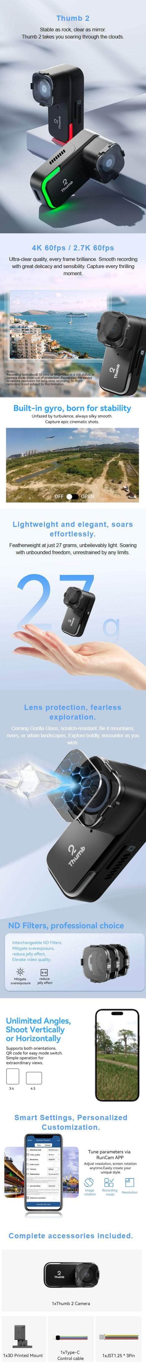The RunCam Thumb 2 back with more features, packed in a mini form factor. Coming in at a lightweight 27g, this camera is perfect for your next FPV micro flight! This mini camera features 4K resolution and allows you to shoot in a horizontal or vertical orientation through remote control HD recording. The built-in gyro supports Gyroflow to perfectly output smooth and stabilized video. ND filter set included!