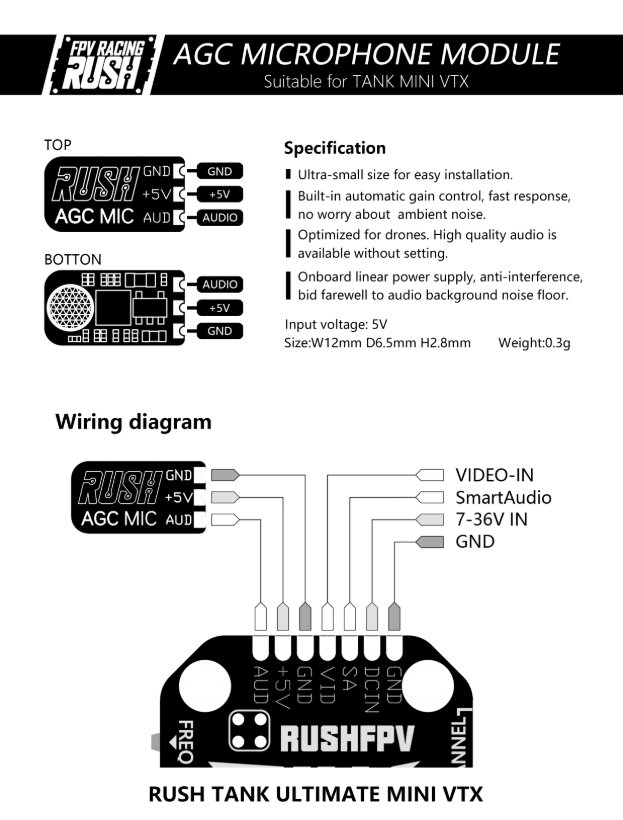 - 1x Rush FPV Ultra-small External Automatic Gain Control VTX Microphone