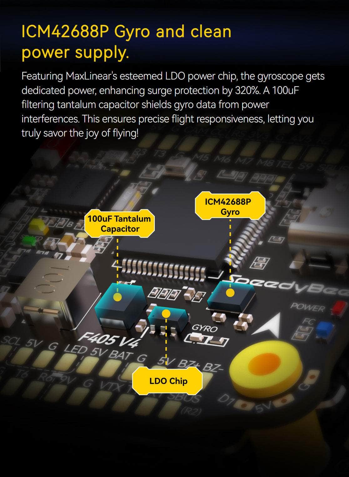 The powerful 55A (70A burst) 4-in-1 ESC, built with aluminum alloy heat sink + TVS protective diode + Japan made TDK SMT capacitors + external 1000uF low ESR capacitor, everything is for a durable build and smooth flight.