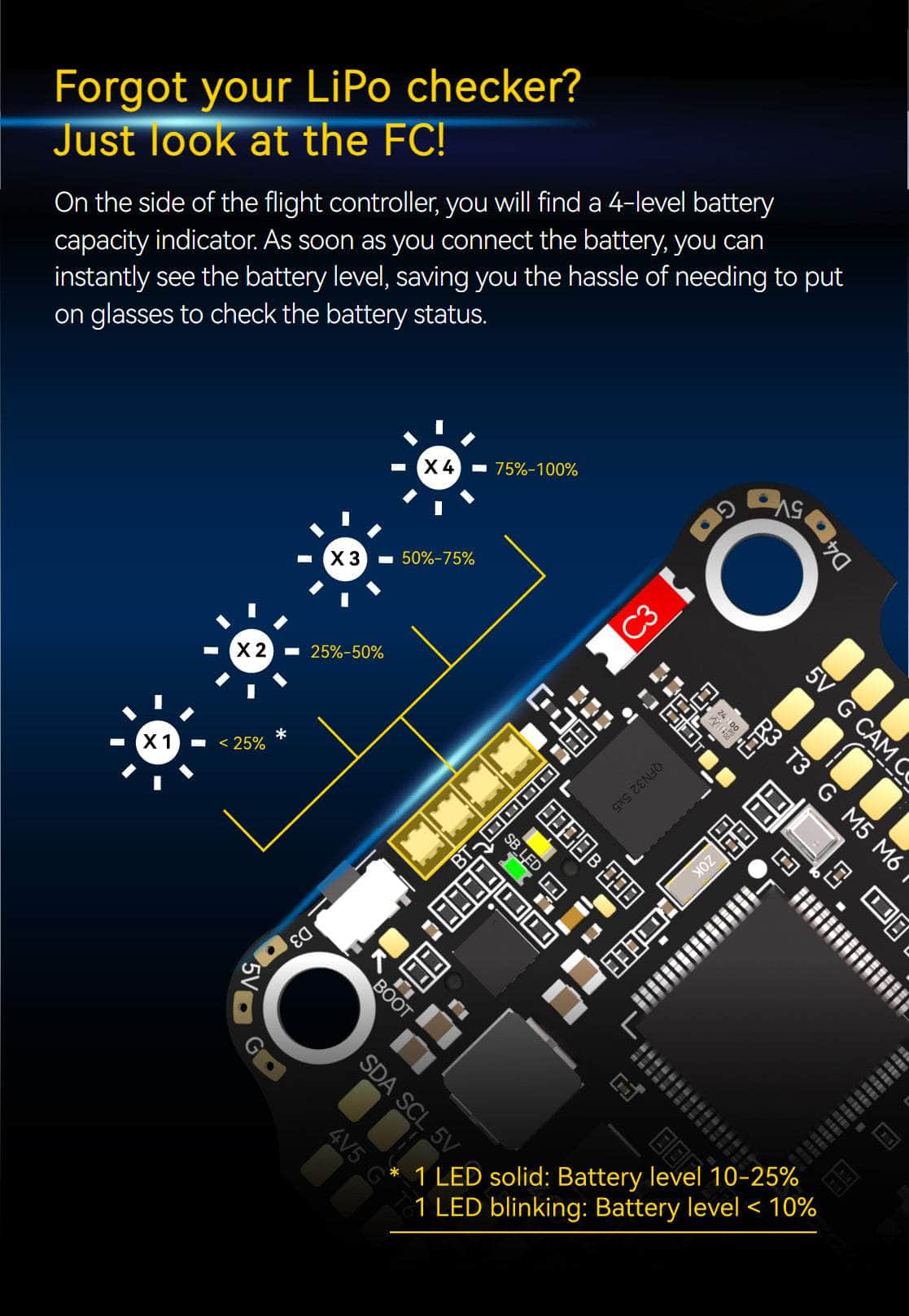 [B]. When the FC is powered on and in standby mode, the BOOT button can be used to controller the LED strips connected to LED1-LED4 connectors on the bottom side. By default, short-press the BOOT button to cycle the LED displaying mode. Long-press the BOOT button to switch between SpeedyBee-LED mode and BF-LED mode. Under BF-LED mode, all the LED1-LED4 strips will be controlled by Betaflight firmware. - RSSI Input: Supported. Named as RS on the front side.